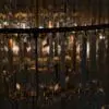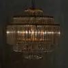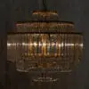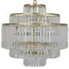 The five-tiered Quintus Chandelier pairs antique brass bands with cascading faceted rectangle glass prisms, creating a tiered silhouette that blends vintage style with modern refinement.
