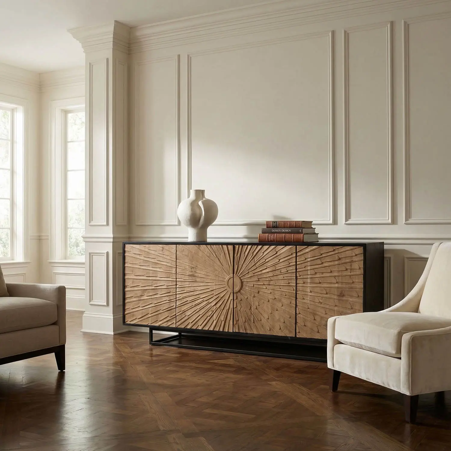 This mid-century modern sideboard boasts a mahogany body featuring beautifully carved starburst doors. The hand-finished woods, with contrasting finishes, highlight the intricate grain while providing ample storage space.
