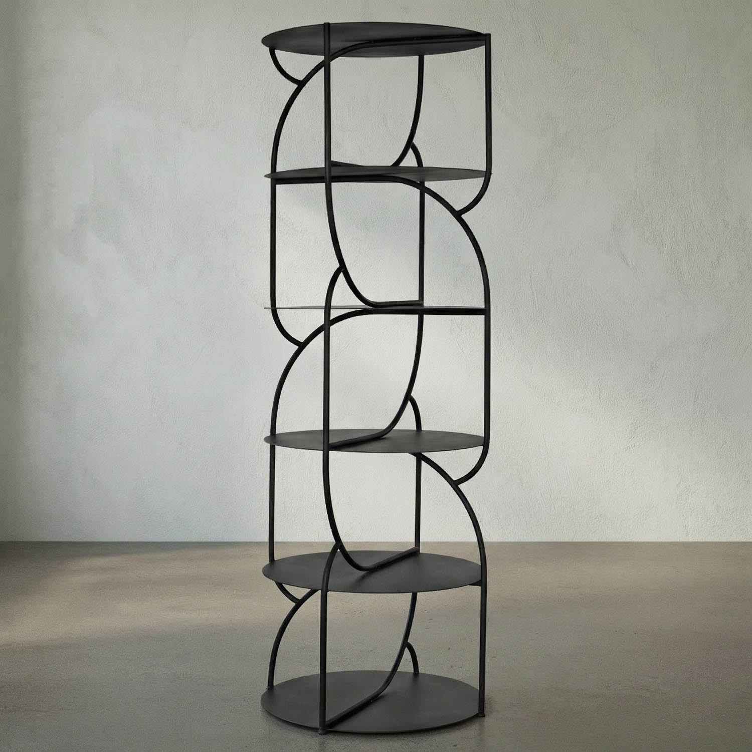 The sculptural Rain Shelf features curved matte black iron supports that gracefully spiral around five circular shelves. Its rhythmic, looping form provides both storage and a dynamic visual appeal.