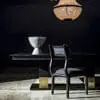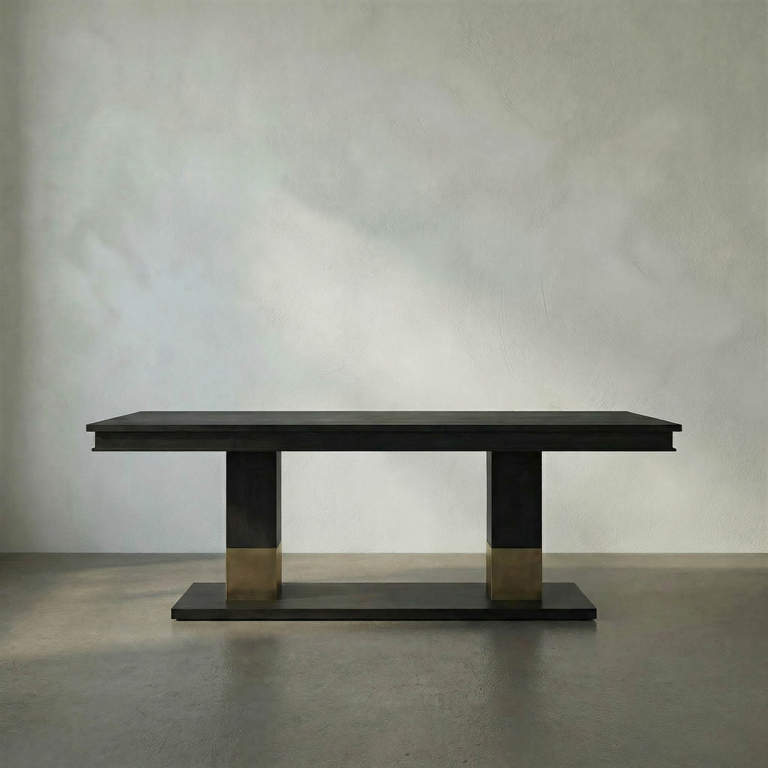 Rectangular mahogany table in our Hand-Rubbed Black finish features columnar legs, with Antique Brass accents. An elegant design combines the natural wood beauty and refined details, perfect for modern, transitional, and industrial dining interiors.