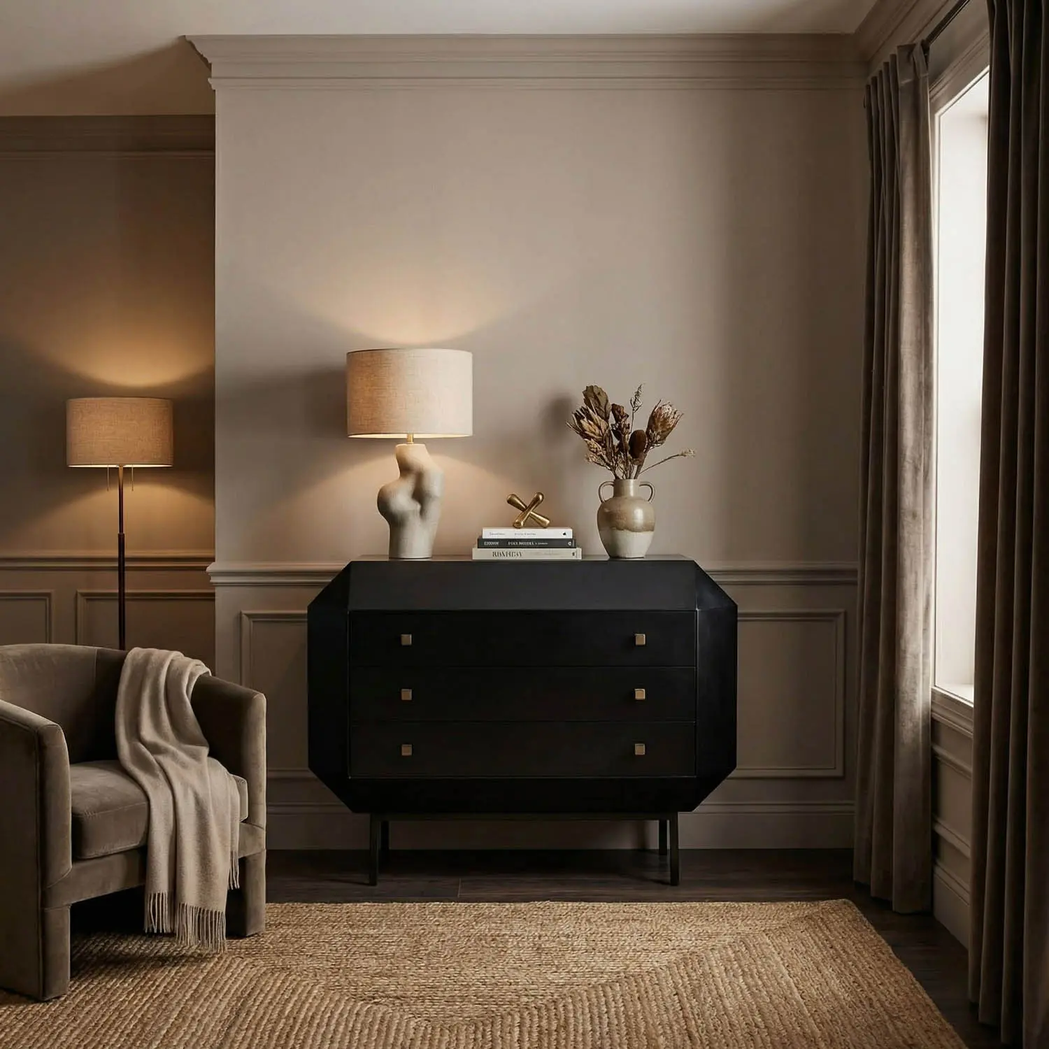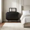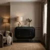 The Rhiana Dresser features our Hand-Rubbed Black finish, slim tapered legs, and subtle angular detailing. A hidden top drawer with mirror and key adds function to its refined, vintage-meets-modern silhouette.
