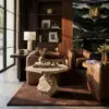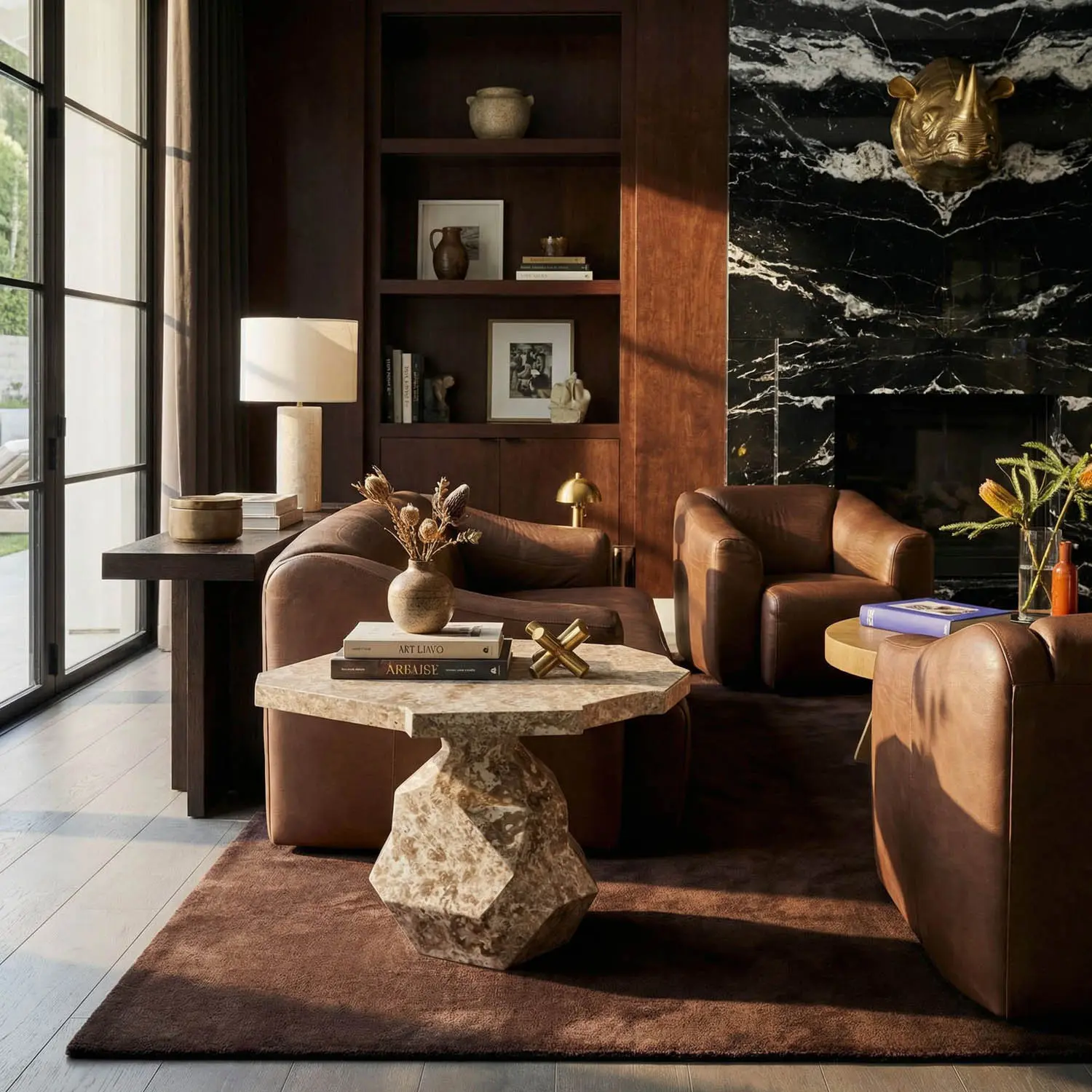 Carved from solid cream marble, this striking and substantial side table features bold, geometric faceting that contrasts with the earthy material.
