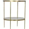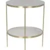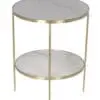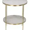 The Rivoli Side Table features a round white marble top and a matching shelf, all supported by a slender antique-brass frame, in a transitional style with subtle Art Deco influences.