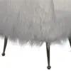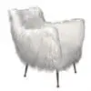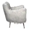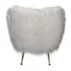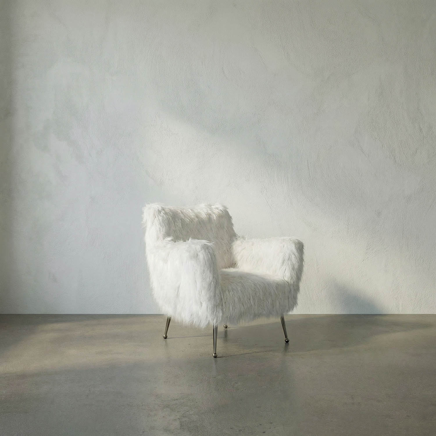 The Rodney Chair features soft white faux flokati upholstery with a rounded, cozy shape. It rests on slim, matte bronze metal legs, combining comfort and modern style for versatile living spaces.