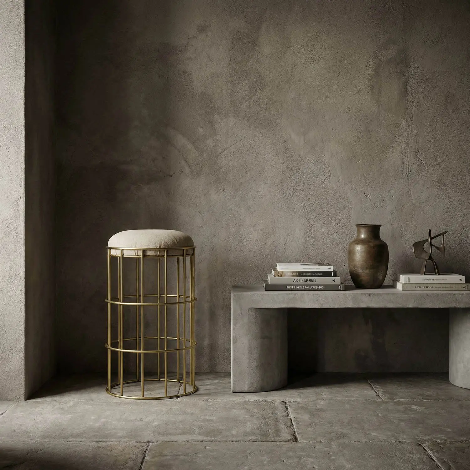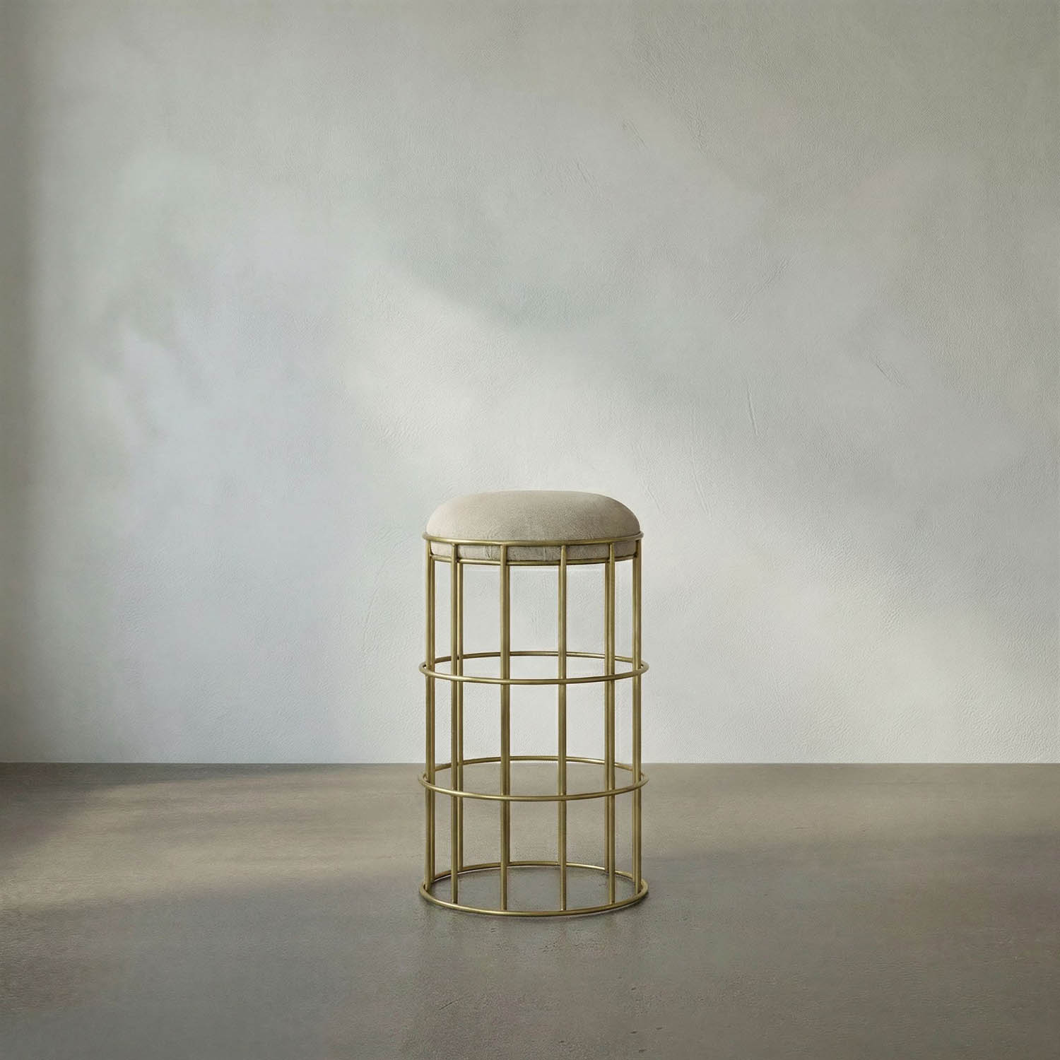 The Ryley Counter Stool features a geometric, cage-style iron base in an Antique Brass finish, topped with a light linen seat. Its airy, sculptural design combines Art Deco inspiration with contemporary sophistication.