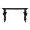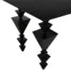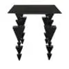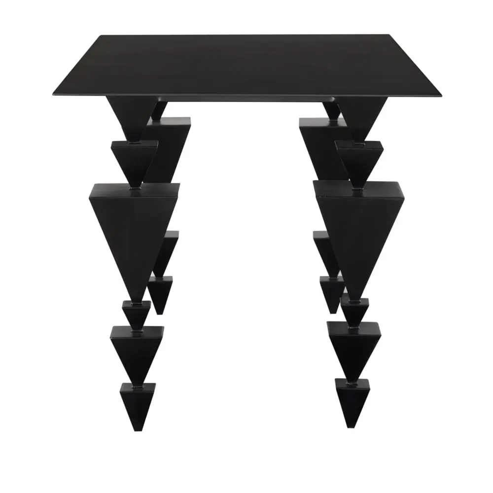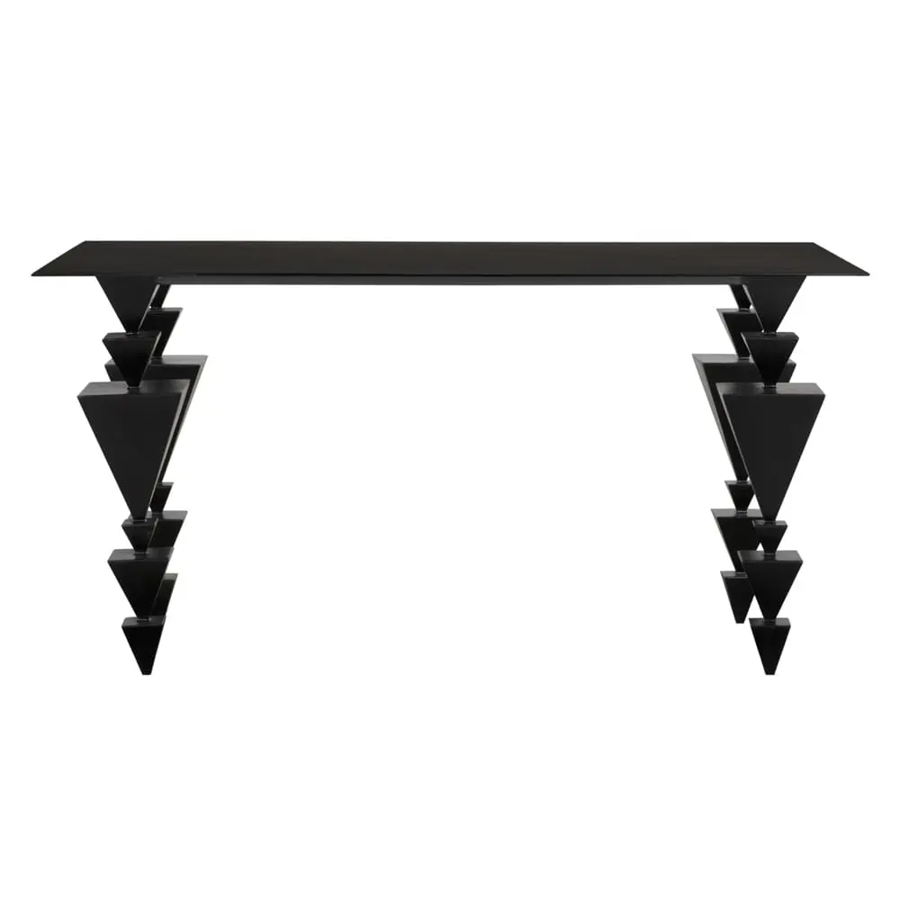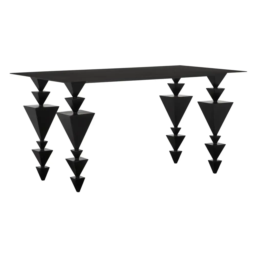 The Sagrada Desk features a sleek, minimalist design made of matte black iron. Its unique inverted stacked pyramid legs create a striking architectural statement.