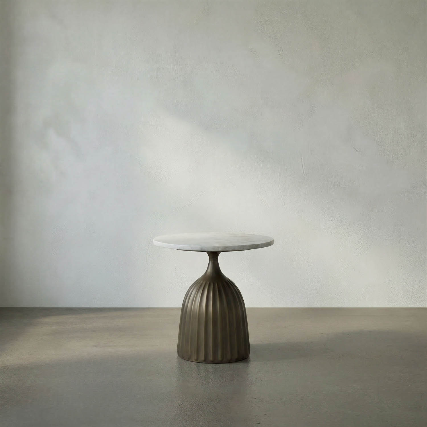 A small, round side table featuring a white marble top and an elegantly proportioned fluted Aged Brass pedestal; it balances bold geometry with refined materials, evoking a sense of modern luxury and architectural minimalism.