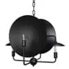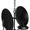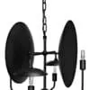 The Satellite Lamp features a matte black iron frame with a central globe surrounded by four conical shades–two angled upward, two downward. Its balanced, radial design evokes mid-century modern, creating both functional and sculptural lighting.
