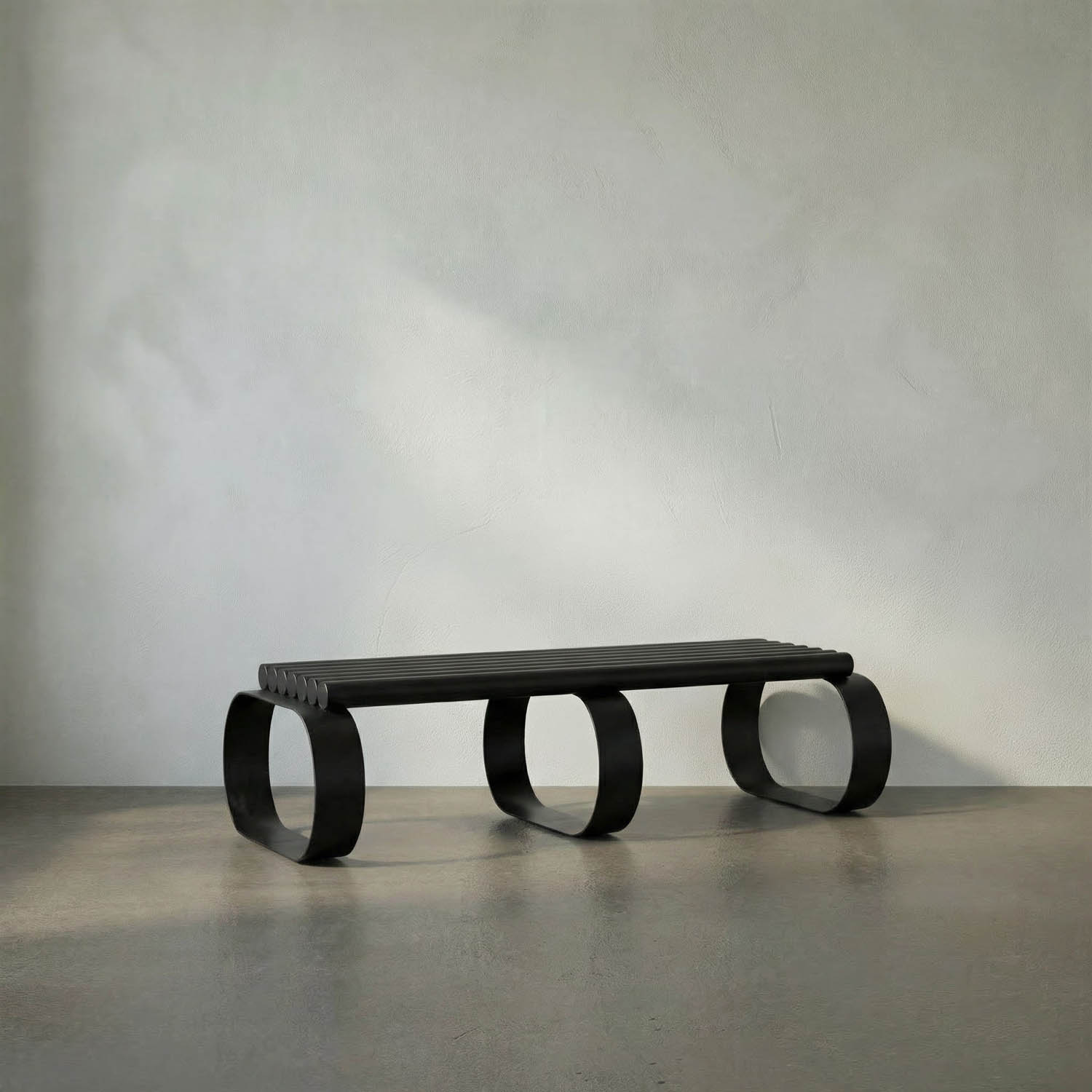 The modern Satish Bench features a cylindrical seat with slats supported by three bold, elliptical loop legs. The all-black iron construction emphasizes its sleek, sculptural quality, creating a striking silhouette.