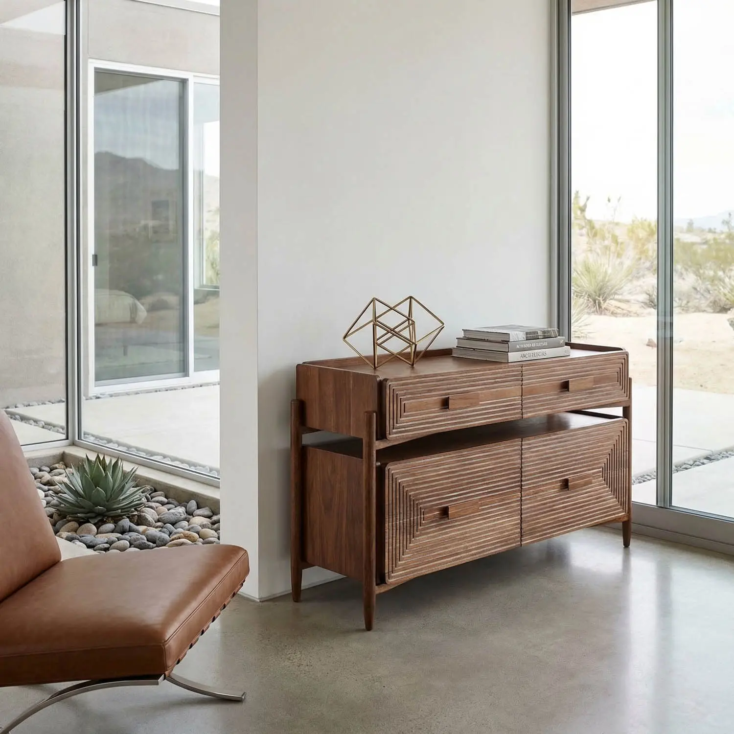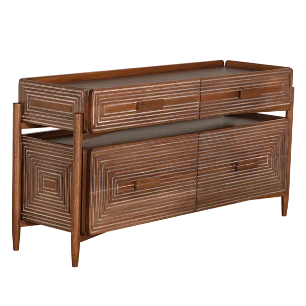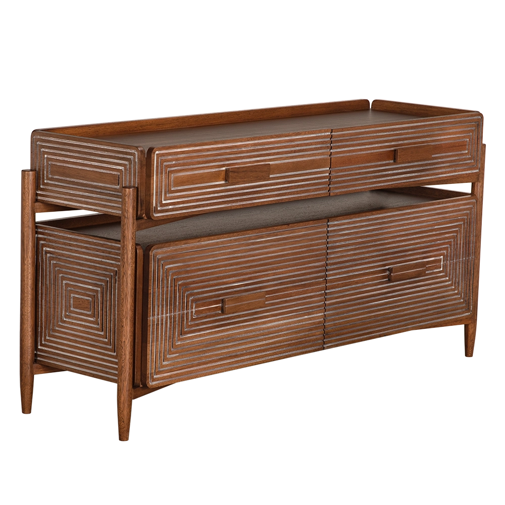 This four-drawer, tray-topped mid-century modern sideboard features a striking geometric design with whitewashed concentric rectangular carvings on the drawer fronts and side panels, which contrasts with the rich, Dark Walnut finish.