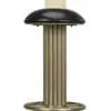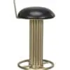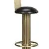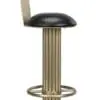 The Sedes Bar Stool showcases a sleek Art Deco style with geometric lines, featuring a iron base finished in antiqued brass and a black leather seat–combining luxury and sophistication in a swivel design inspired by the 1920s.