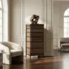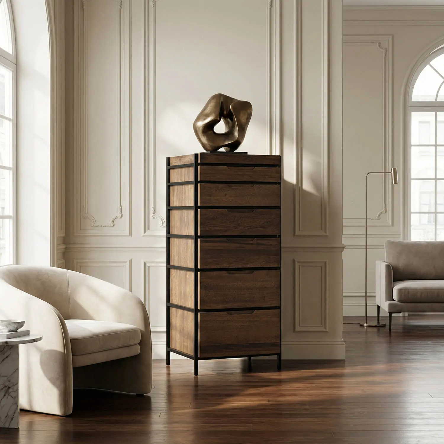 Our Dark Walnut-finished Seoul Tallboy embraces minimalist design with clean lines and a sleek silhouette, making it a striking addition to any room. Featuring multiple drawers, it provides ample, stylish storage that blends functionality with modern design.