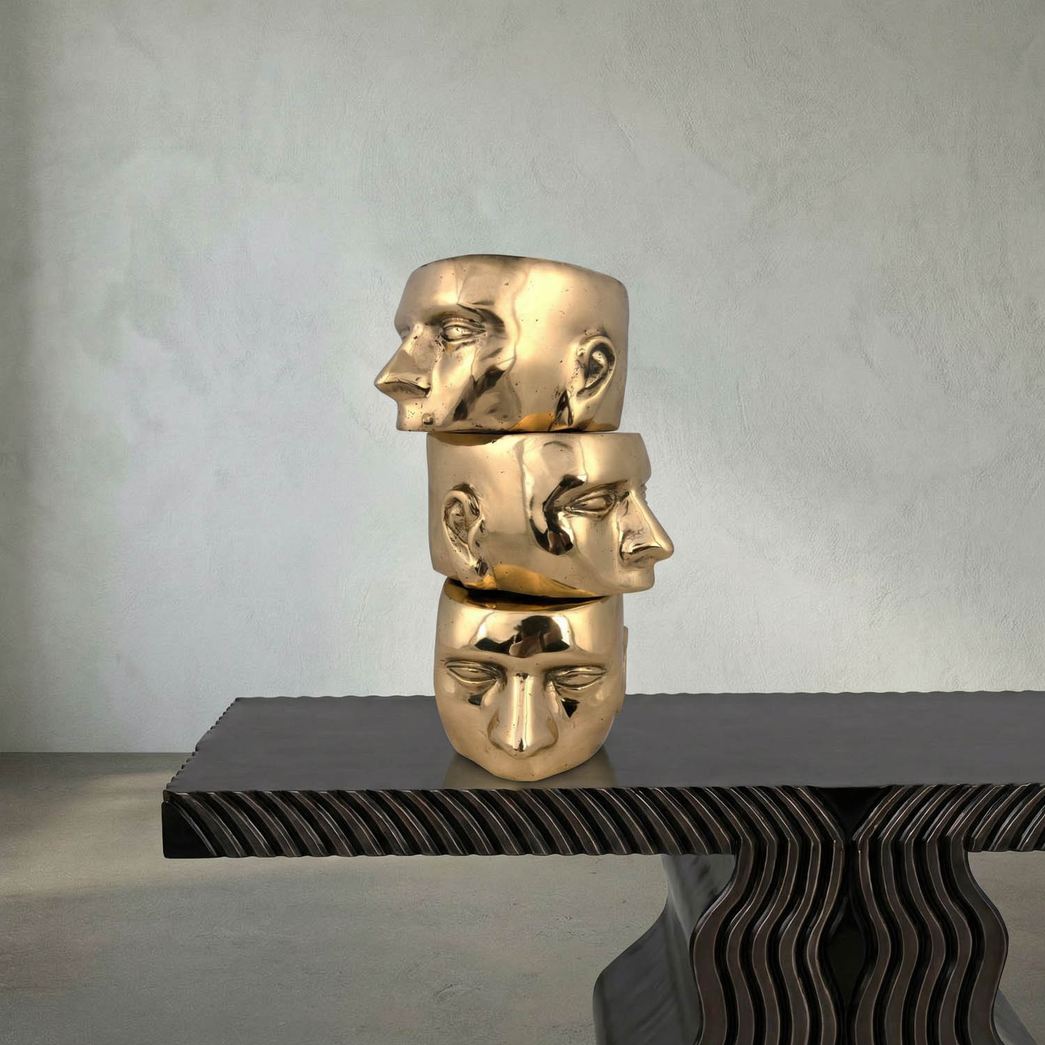 A three-piece brass sculpture featuring stylized human faces. When stacked, the faces can align vertically, creating a bold, modernist character.