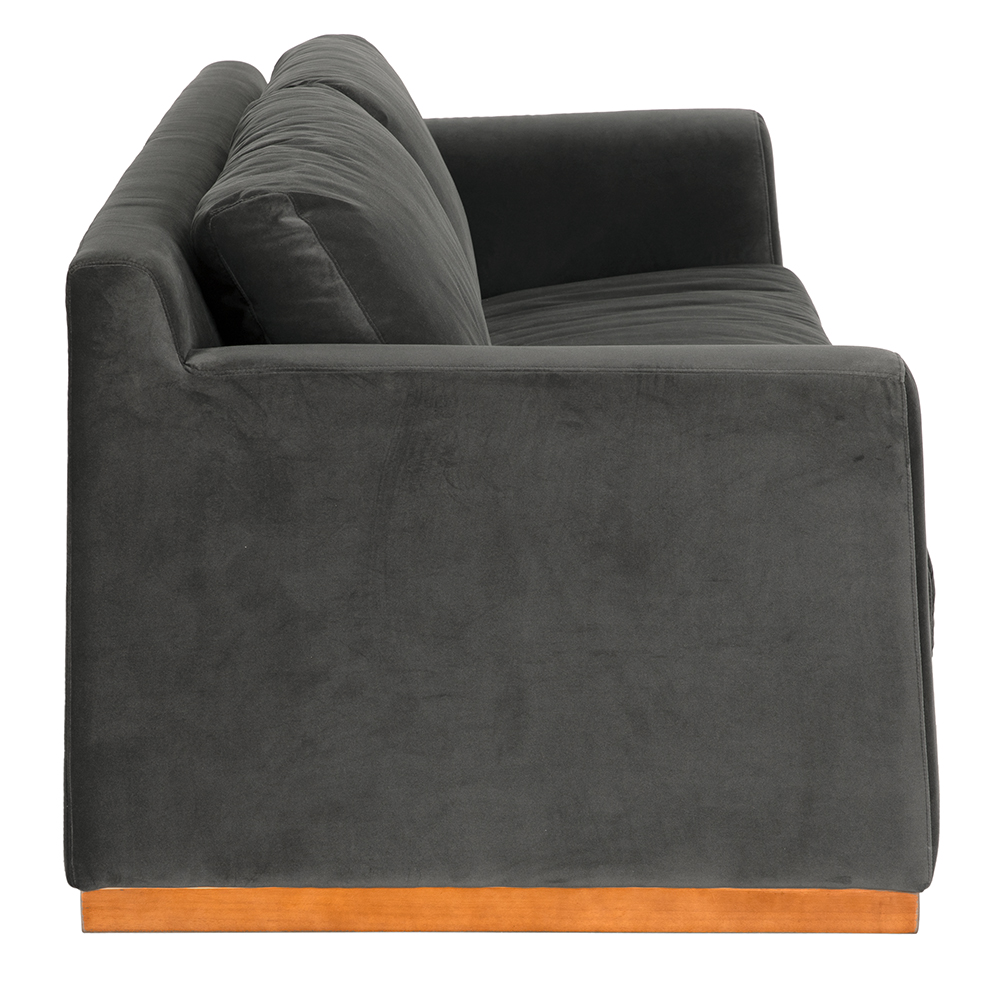 This three-seater sofa features rich charcoal velvet upholstery with gently sloped track arms, deep seat cushions, and a tailored silhouette. A grounded warm walnut plinth base adds architectural contrast and a contemporary foundation.