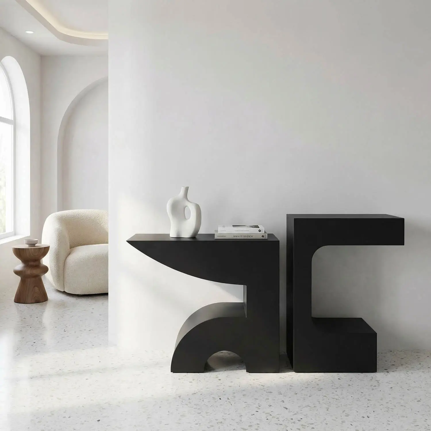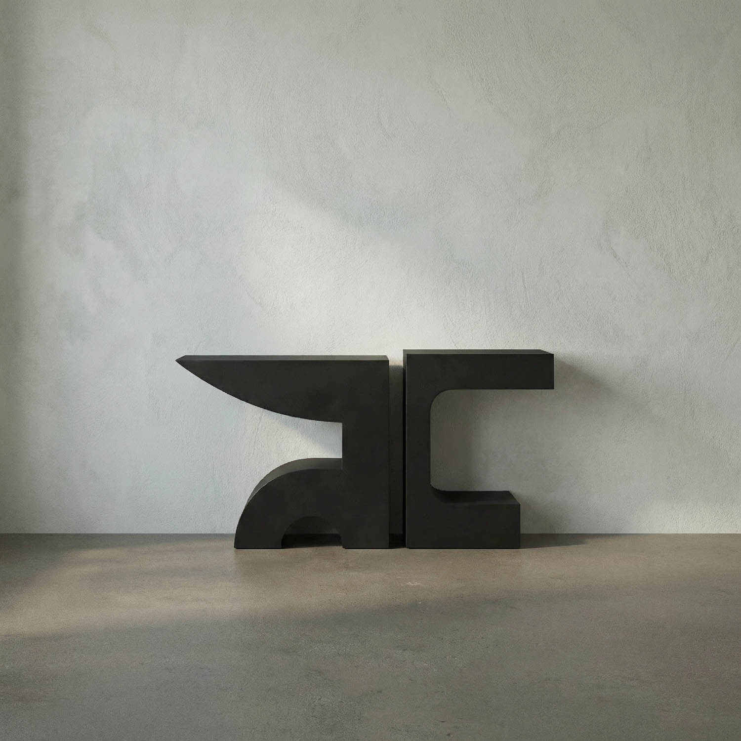The two-piece Shiba Console comprises two geometric forms, characterized by bold cutouts and negative space. Finished in matte black, the design emphasizes symmetry and contrast, creating a striking modern statement.