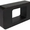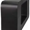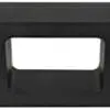 The sleek black Shylock Console features soft, rounded edges and a large central cutout, creating a monolithic silhouette. Its smooth finish and striking negative space provide a distinctly modern, minimalist appeal.