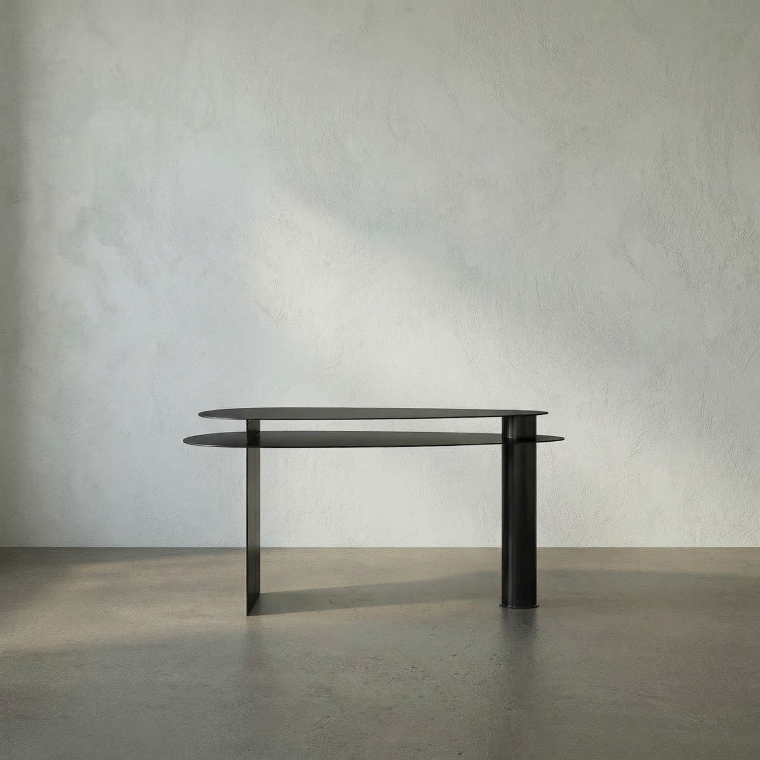 The two-tiered Sita Desk embodies industrial boldness with its matte-black iron structure, expansive surface, and minimalist form–designed to be visually striking, structurally robust, and distinctly modern.