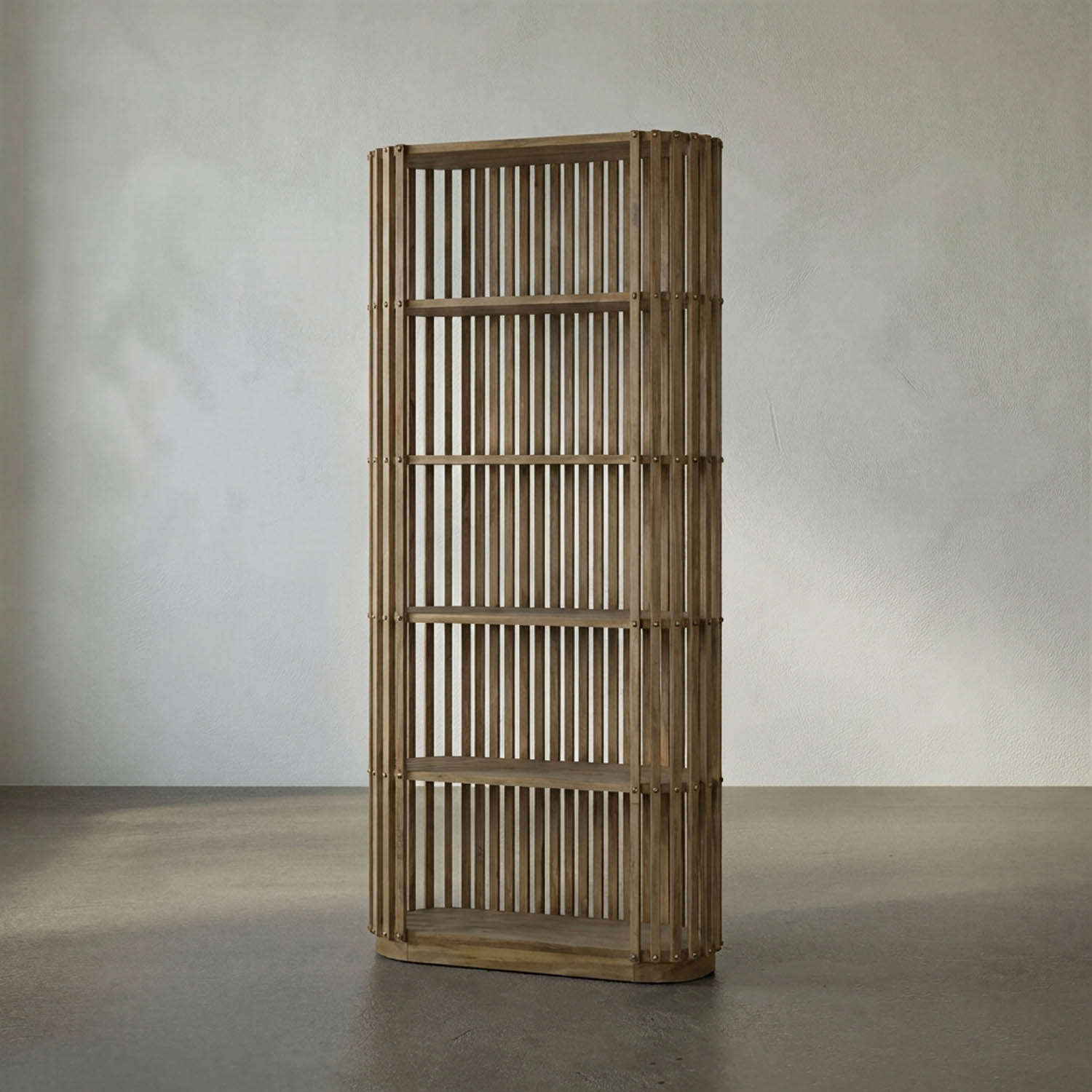 A slim version of our classic Opal bookcase features the same linear construction in handsome teak, with chunky antique brass nailheads along each outer fixed shelf line and a natural clear coat finish.