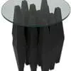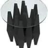 This round side table showcases interlocking Matte Black iron legs supporting a glass top. Its geometric and industrial design adds a sculptural accent while offering versatile surface space for modern interiors.