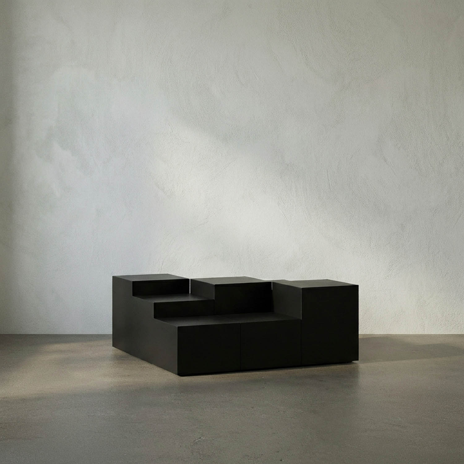 The Stein Coffee Table in our Matte Black finish features layered steps that create a dynamic, tiered effect. These layers not only enhance its modern industrial design but also provide functional surfaces at varying heights for added versatility and style.