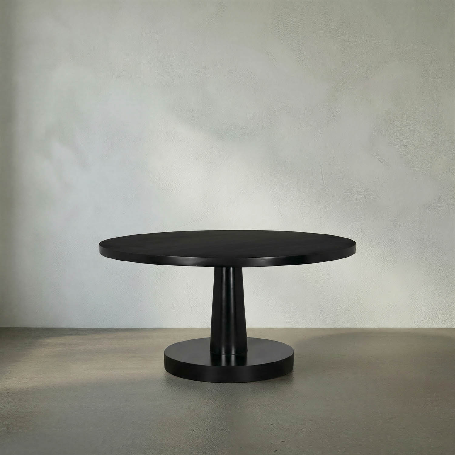 Round mahogany table with Hand-Rubbed Black finish, featuring a bold conical pedestal base, melds classic sophistication with modern sculptural design, creating a striking, timeless centerpiece.