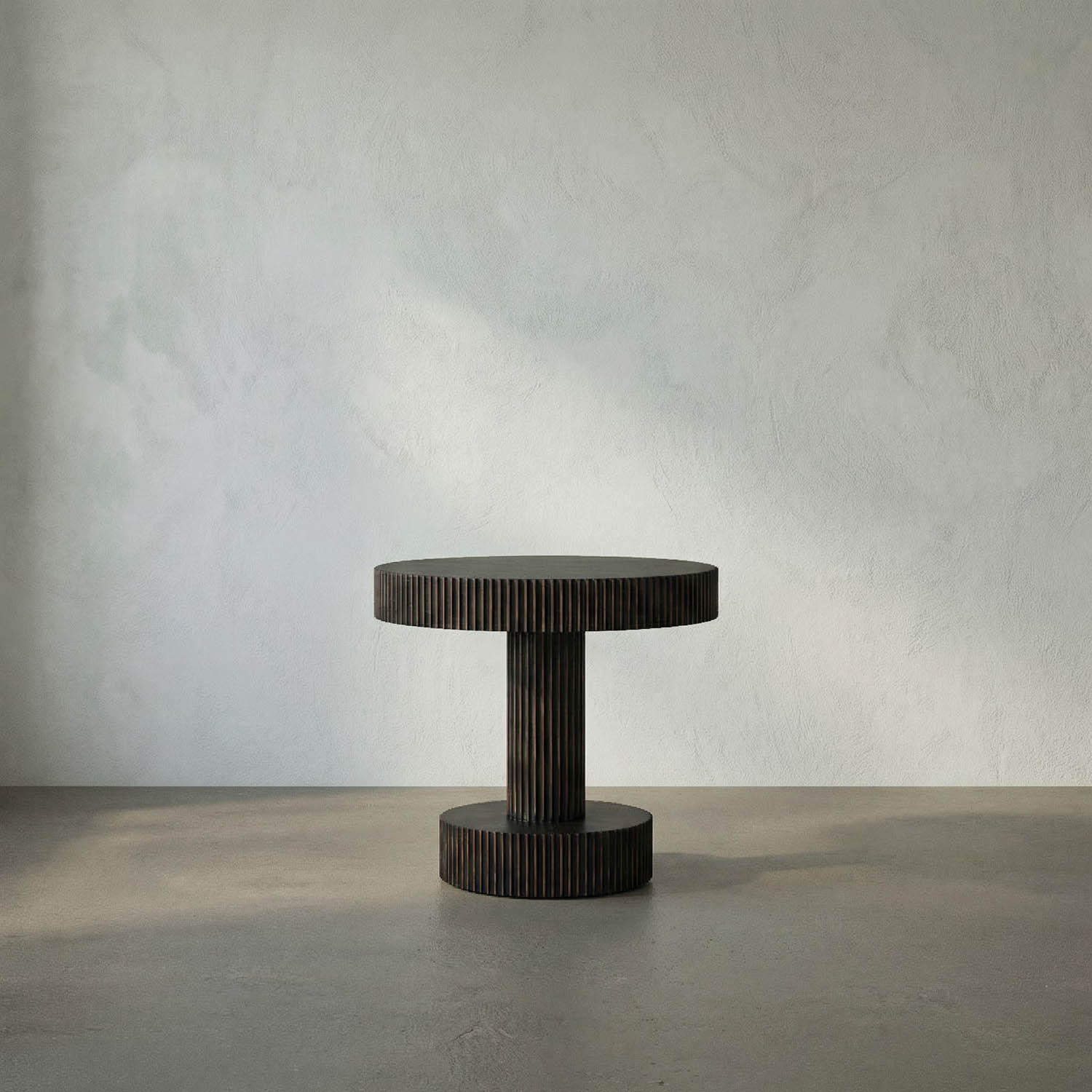 A sculptural blend of minimalist design and mahogany construction, this generous round side table features a Hand-Rubbed Black finish with subtle Light Brown ribbed trim, accentuating the wood to create a subtle yet striking accent piece.
