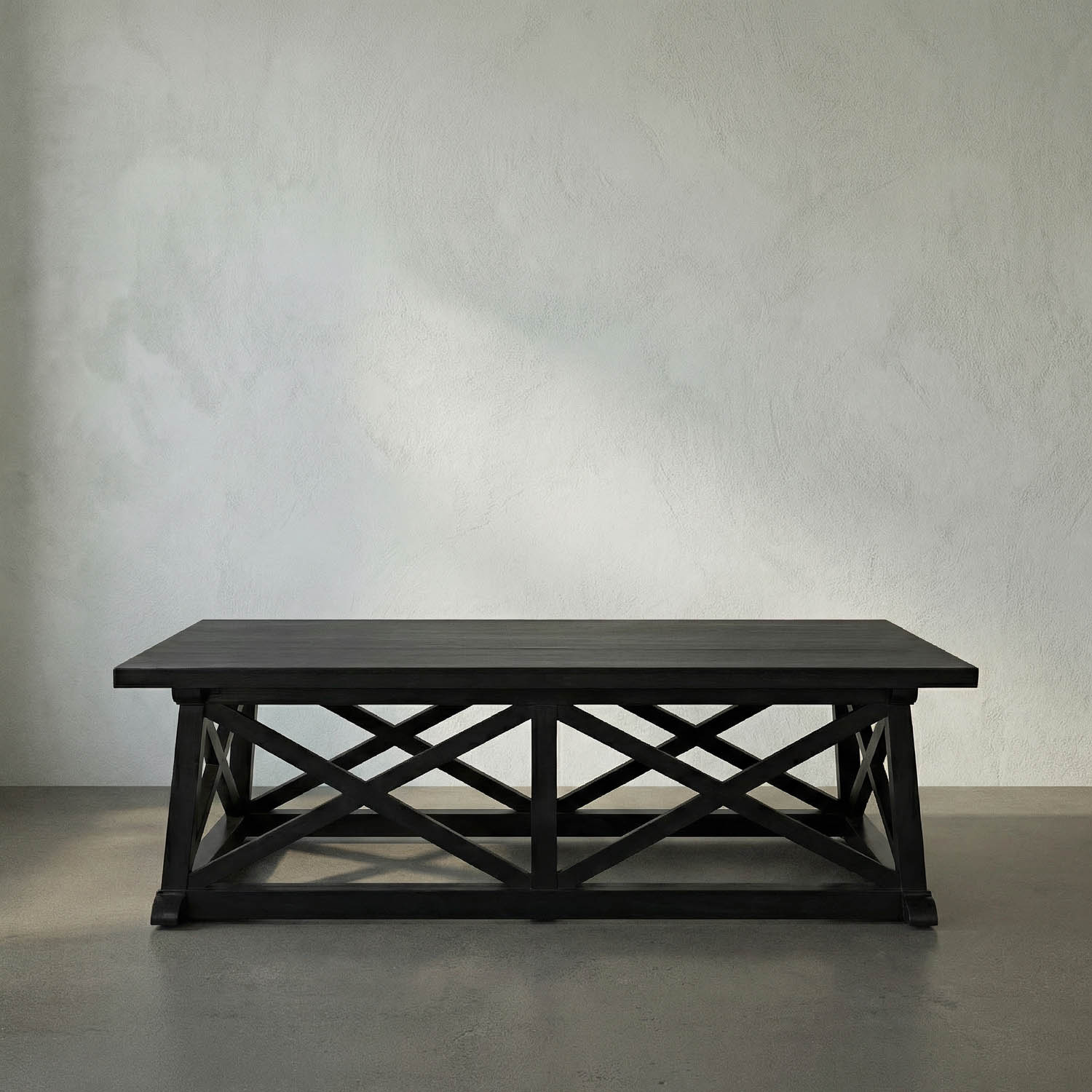 A hand_carved solid mahogany rectangle with our rich Hand_Rubbed Black finish and bold “X” motif base, combining rustic craftsmanship and classic structure for a timeless, sculptural presence.