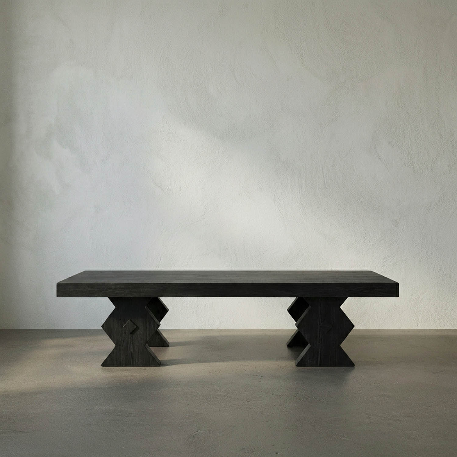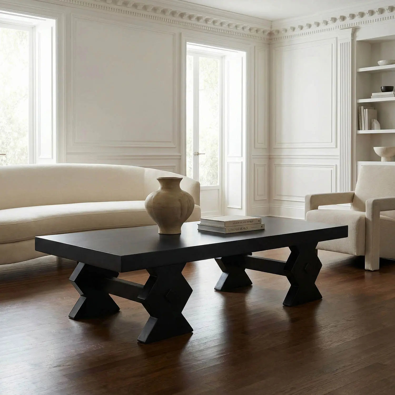 The Suzu Coffee Table features mahogany with a Hand-Rubbed Black finish. Its bold, angular legs and sculptural form exemplify postmodern style, making it a striking centerpiece for contemporary artistic interiors.