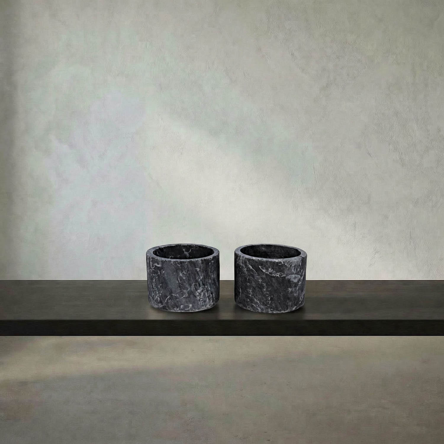 The Syma Candle Holder set features two solid Night Snow Marble pieces, each with a simple, cylindrical shape and flat tops, designed for use with pillar candles.