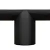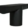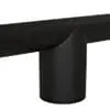 A sleek black metal console table featuring a bold, minimalist design with a thick, flat-topped horizontal cylinder and a single central cylindrical base, creating a clean, sculptural “T”.