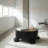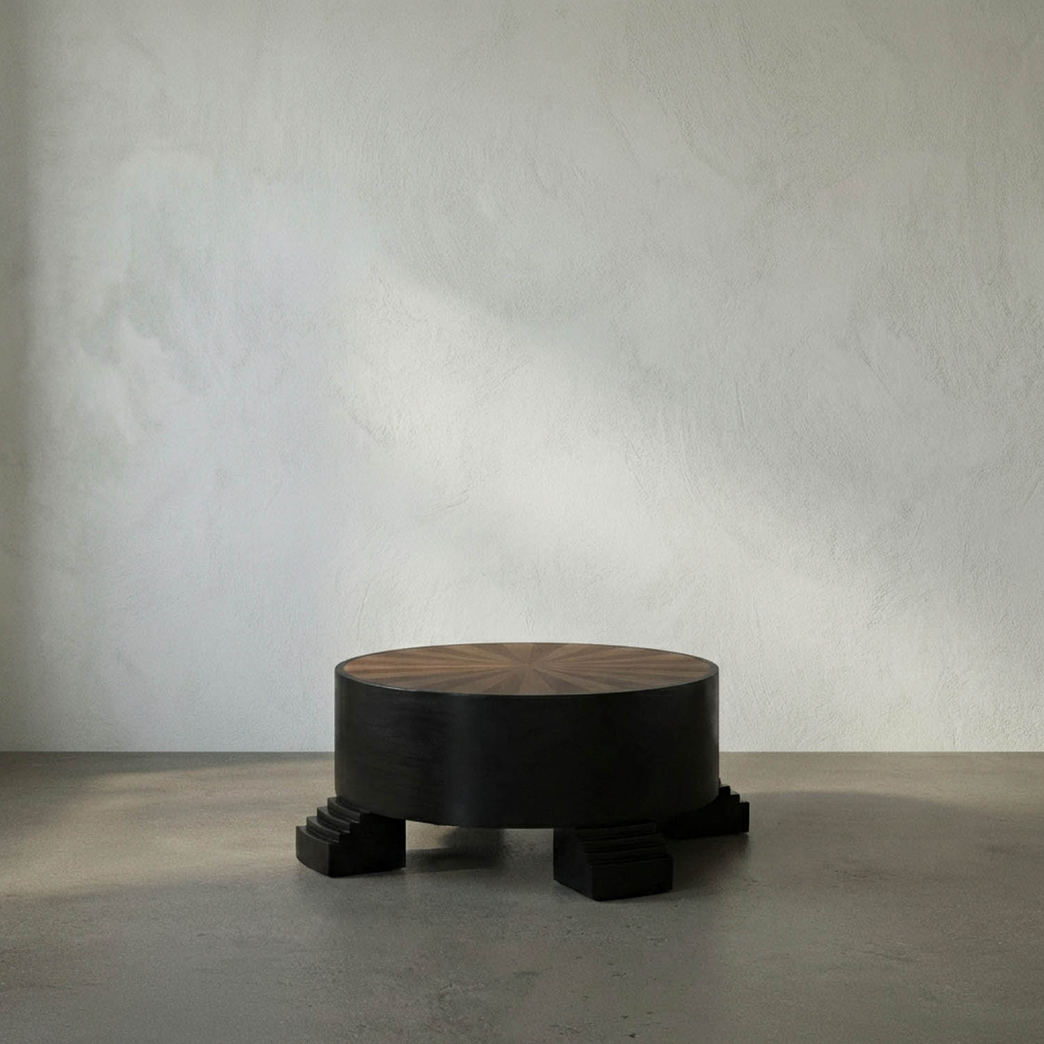 A bold, round mahogany coffee table with a golden finished marquetry top, a Hand-Rubbed Black finished tambour base, and stacked plinth feet creates a grounded, modern look.