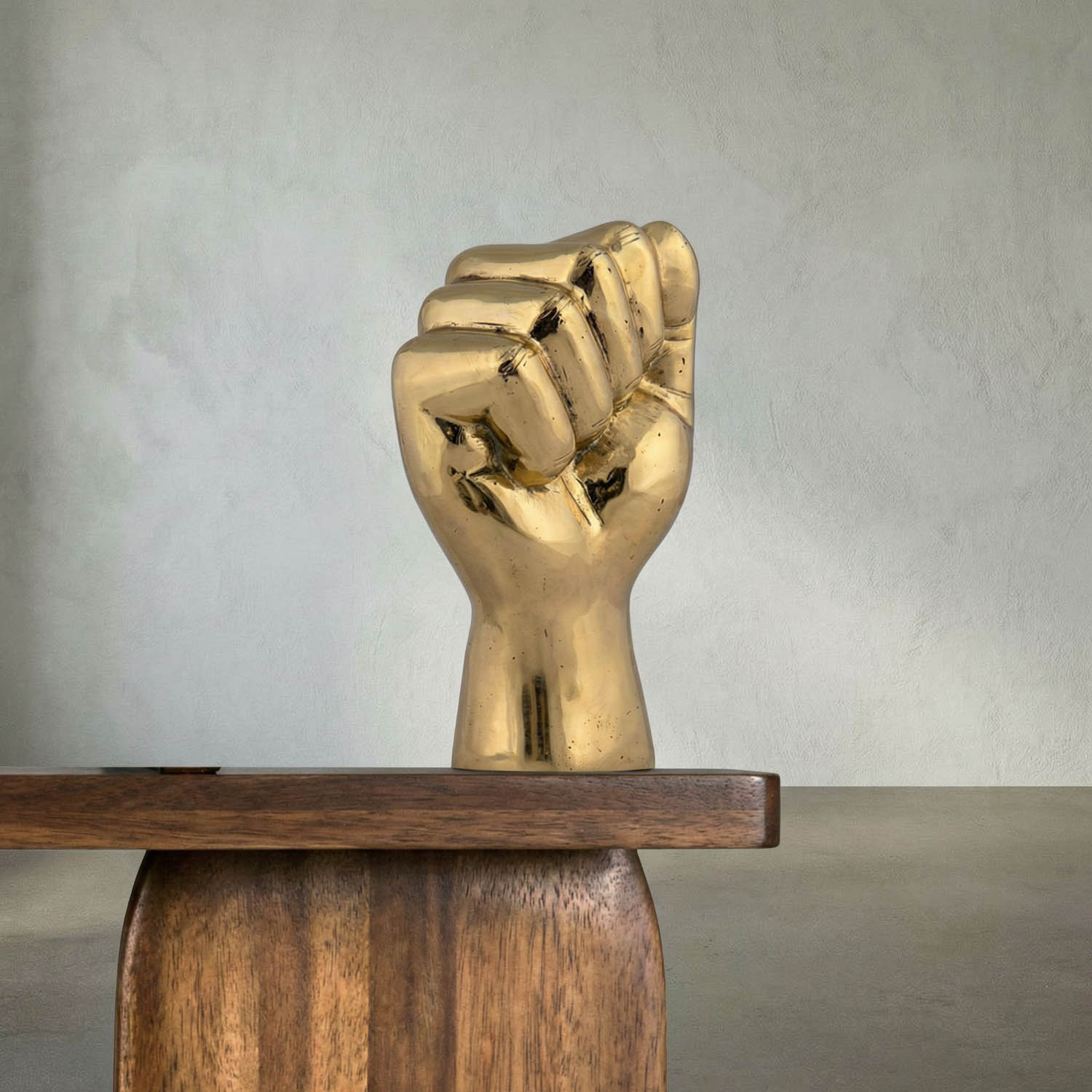 This bold brass sculpture features a clenched fist, symbolizing power, unity, and resilience.