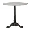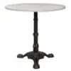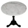 This round cafe-inspired side table features a Bianco Crown marble top accompanied by a matte black teardrop cast iron base. Its industrial yet refined design, along with the natural stone variations, creates a unique and bold accent.
