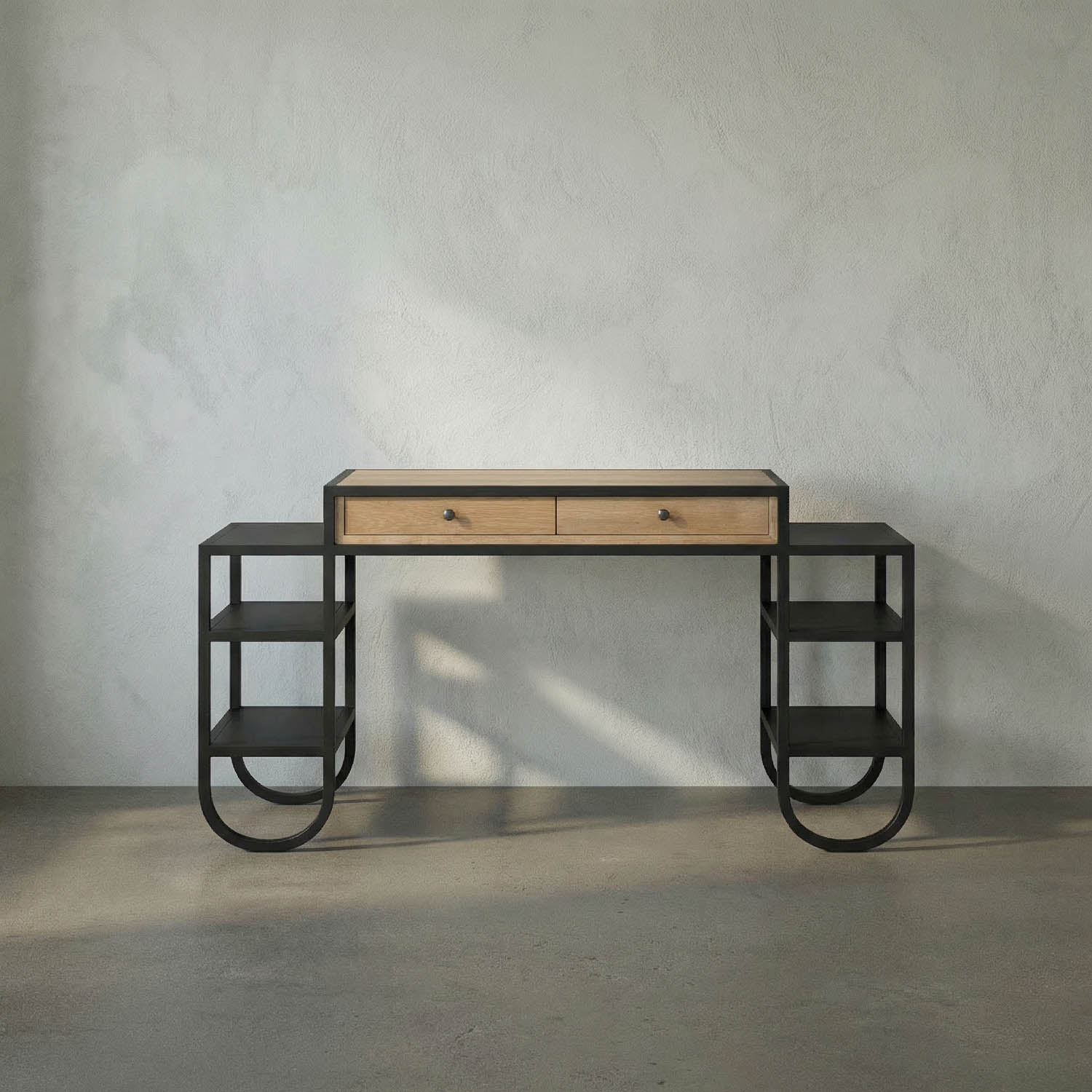 The two-drawer Thomson Desk combines warm oak with matte-black iron, featuring U-shaped leg curves and integrated side shelves, melding sculptural design with industrial craftsmanship for a compact, modern workspace.