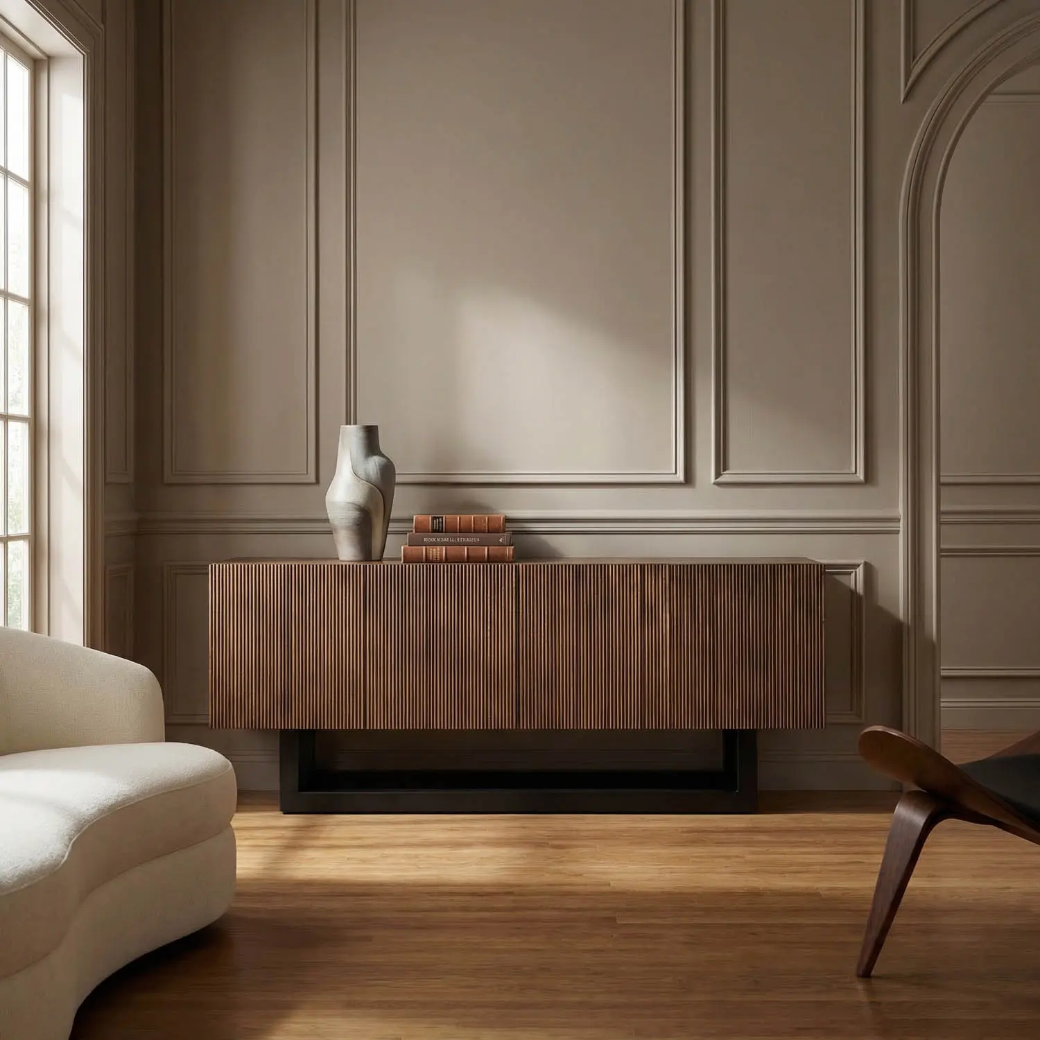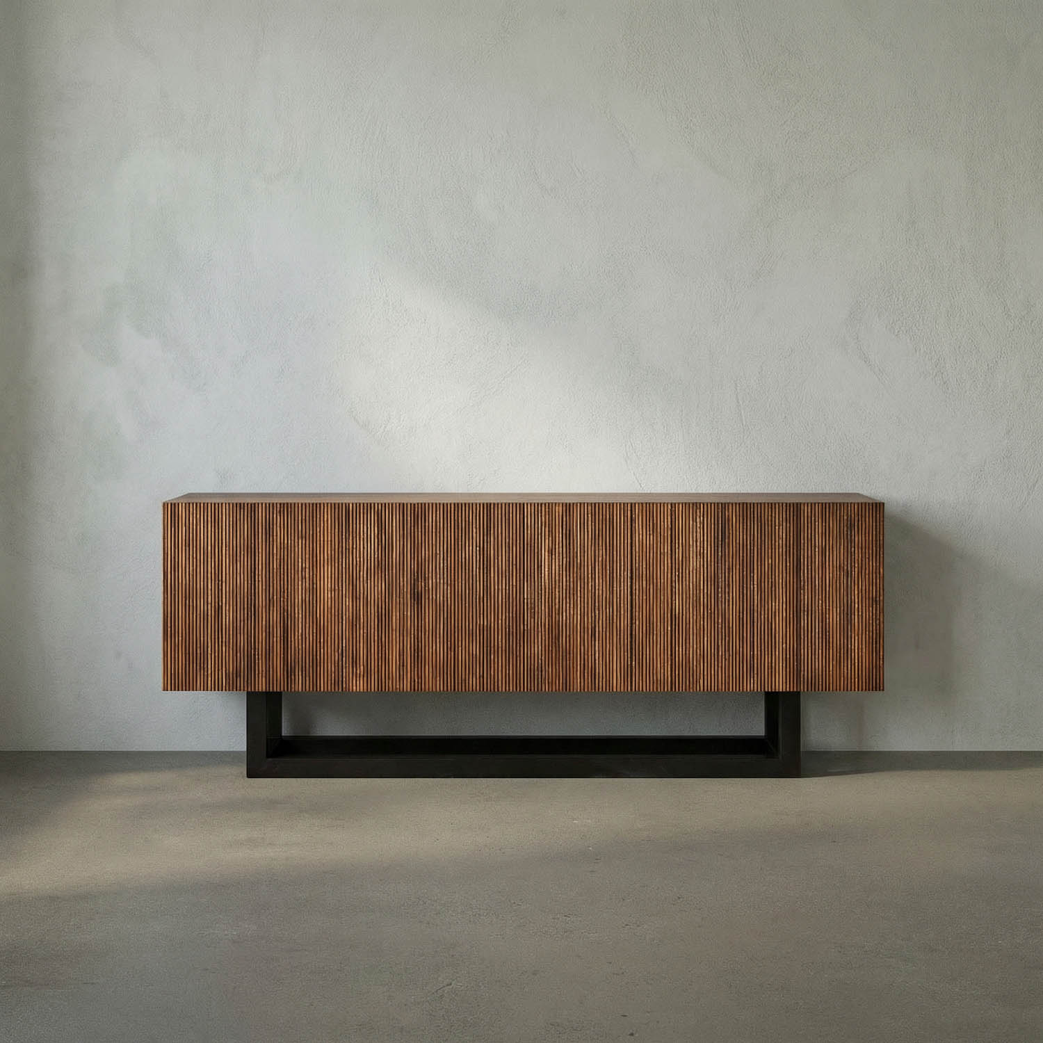 The four-door Thomson Sideboard features rich dark walnut veneer along with matte black iron accents. The doors showcase subtle vertical grooves, blending bold lines and texture for a striking, modern minimalist appearance.