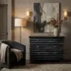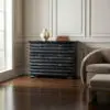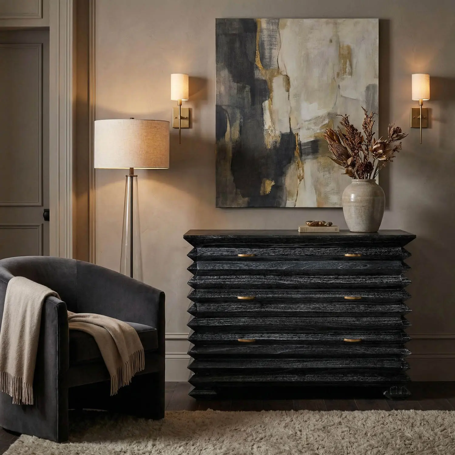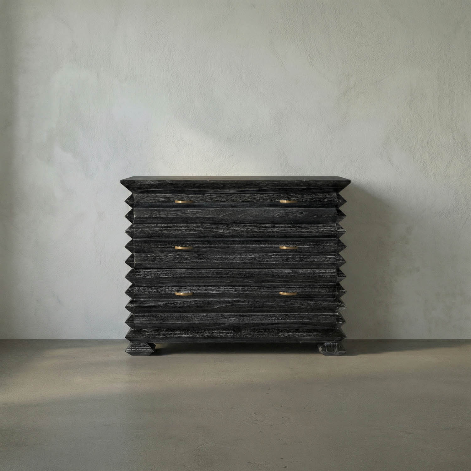 The Tiago Chest features a sculptural, zig-zag body with three drawers, solid brass crescent-shaped handles, and faceted feet, finished in our Cinder Black ceruse finish. Adding refinement, the finish extends to the inside of each drawer.