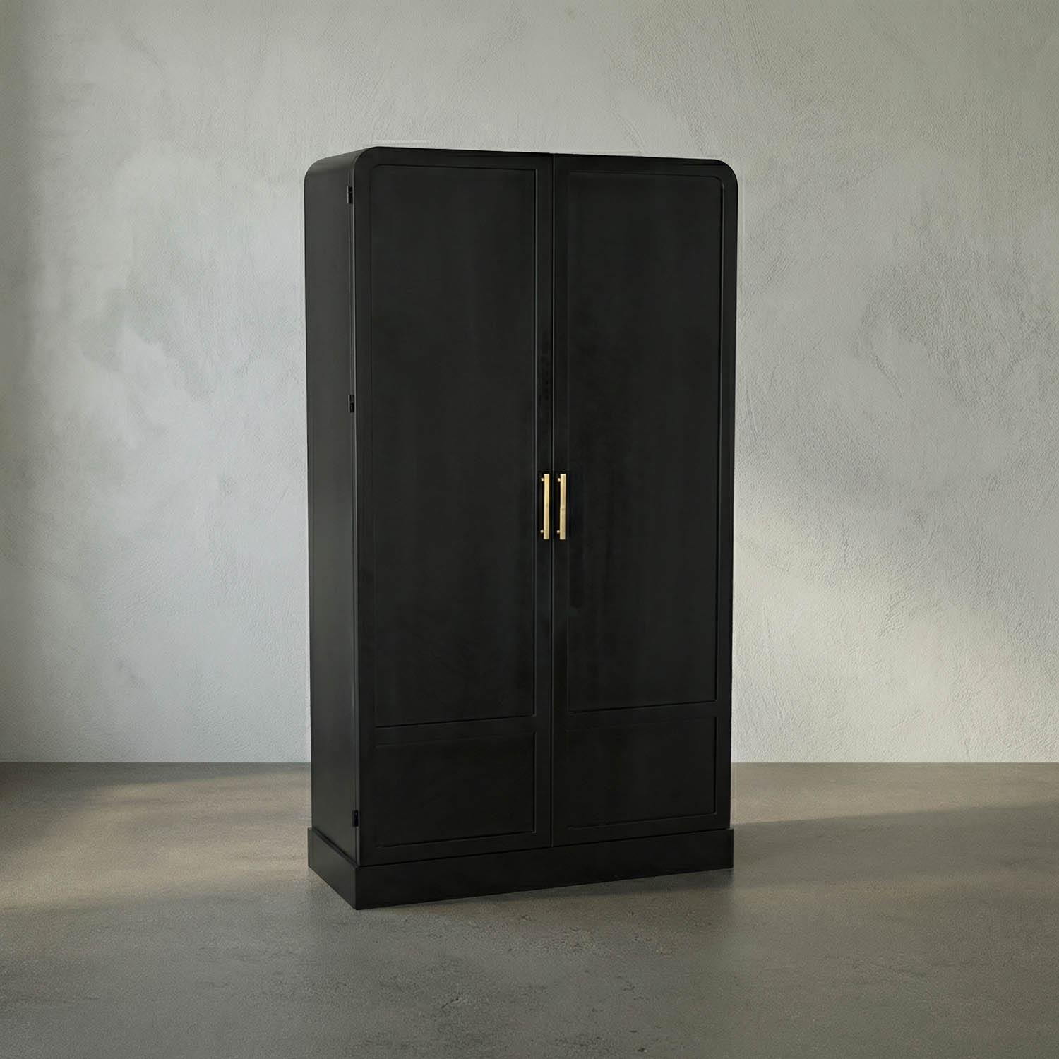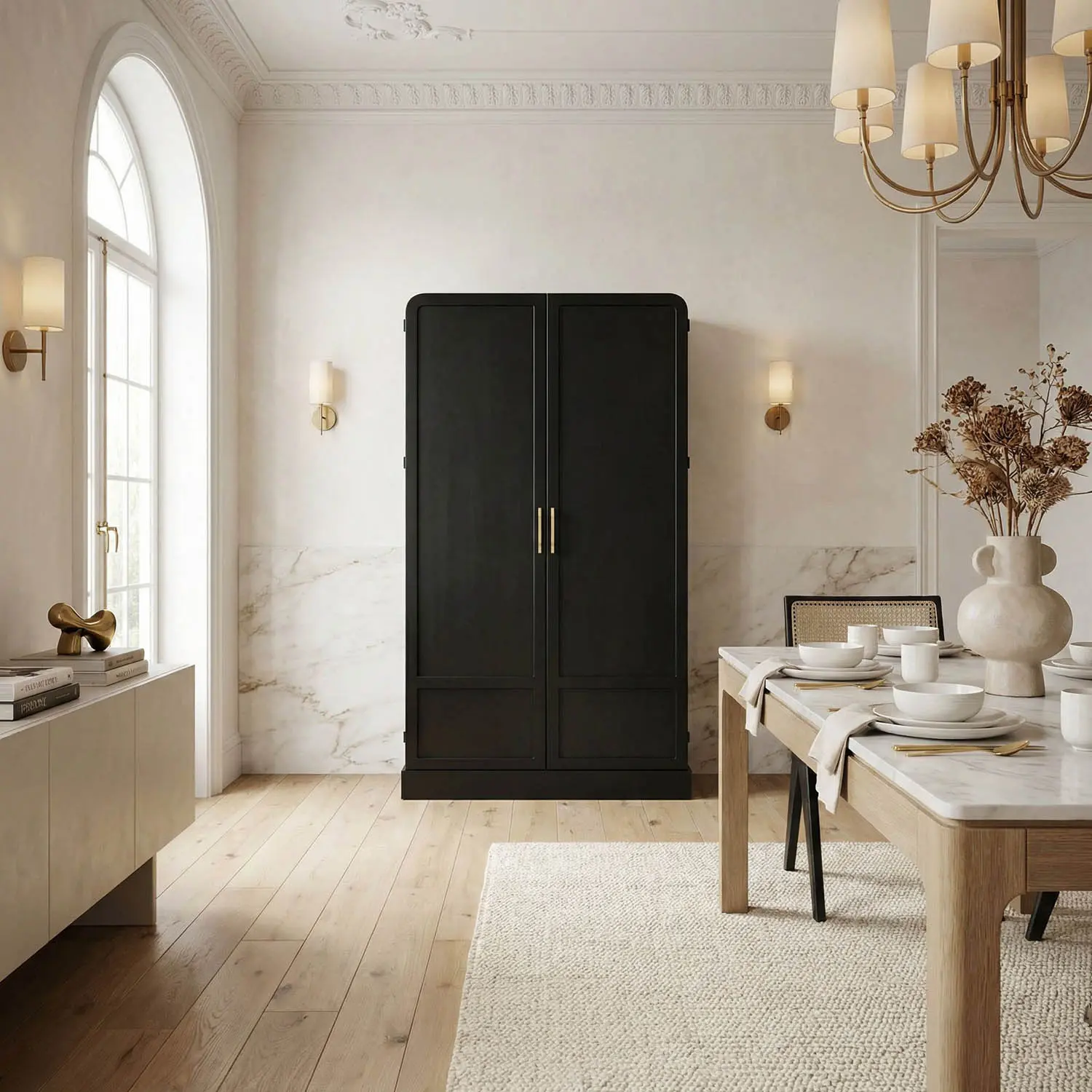 The Tresor Hutch features a matte black finished iron frame with brass hardware and three spacious shelves for sleek, modern storage.