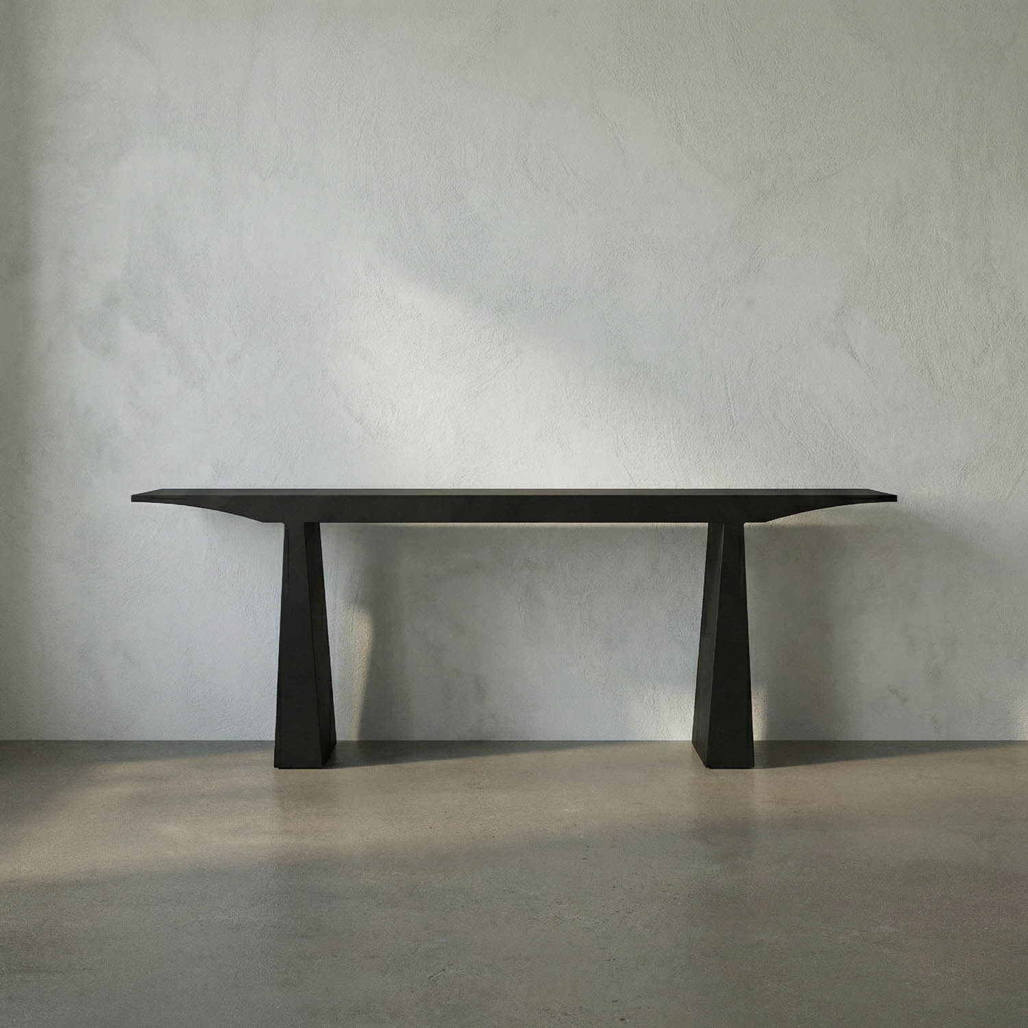 The Noir Truss Console is a minimalist, industrial-style table made from matte black iron. It features a plank-style top with tapered ends, reflecting a Zen-inspired design.