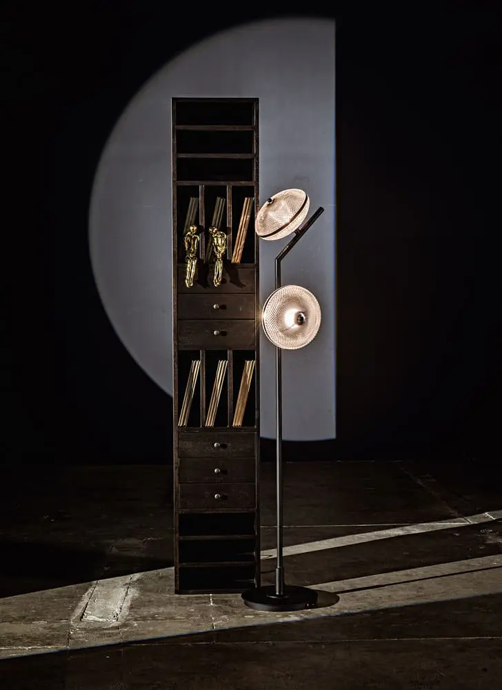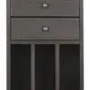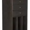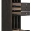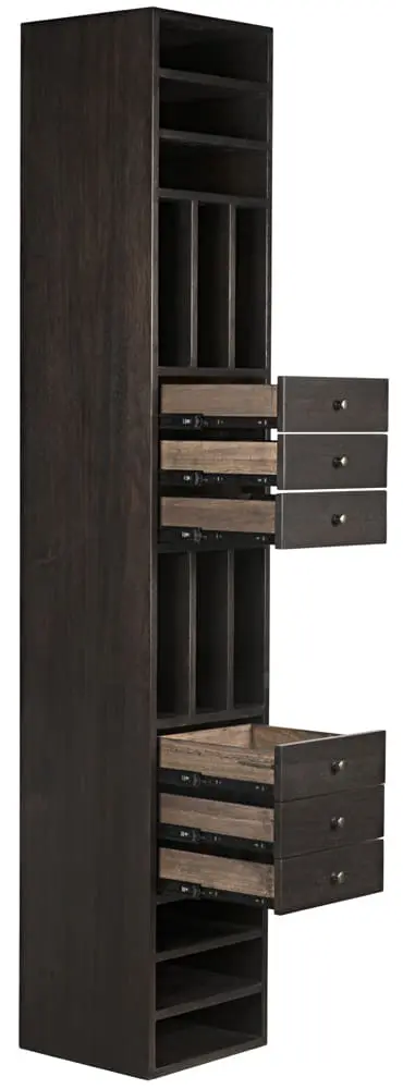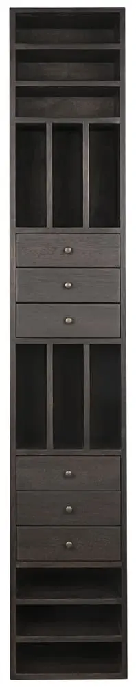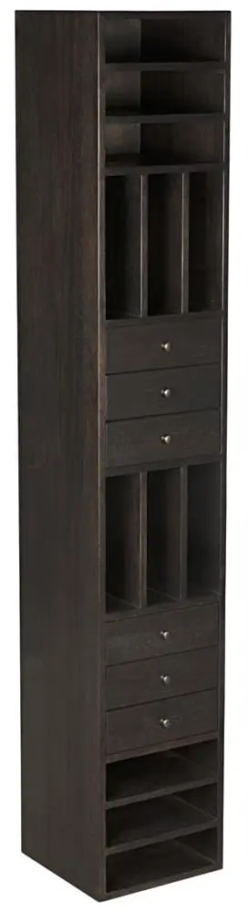 A modern take on a classic, this vertical narrow bookcase has been handcrafted from walnut with a deep ebony finish. Ideal for a home office, it features six drawers and 12 cubbies, offering numerous display and storage options.