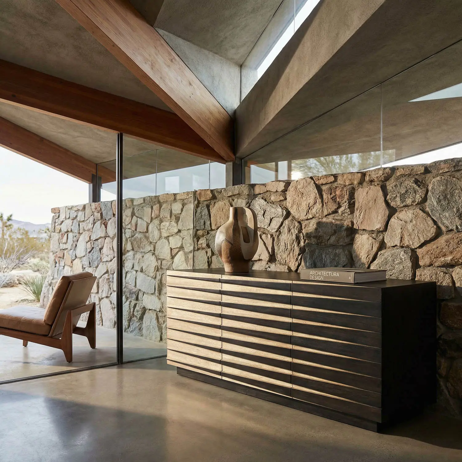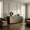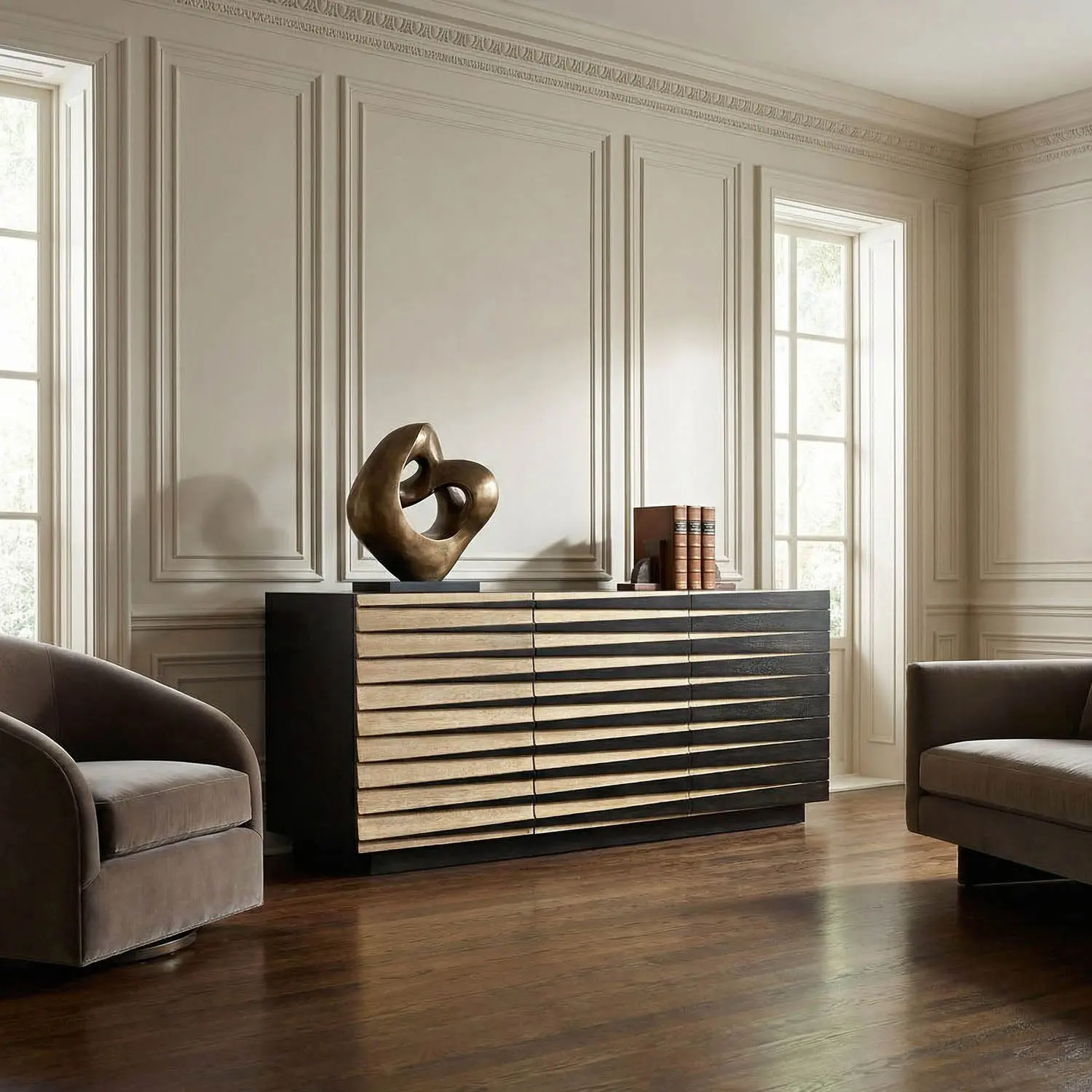 The three-door Tyson Sideboard features a bold, geometric design with a diagonal relief pattern that transitions from our Washed Walnut to Ebony Walnut finish. Three doors conceal ample storage space, combining striking design with everyday functionality.