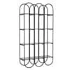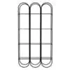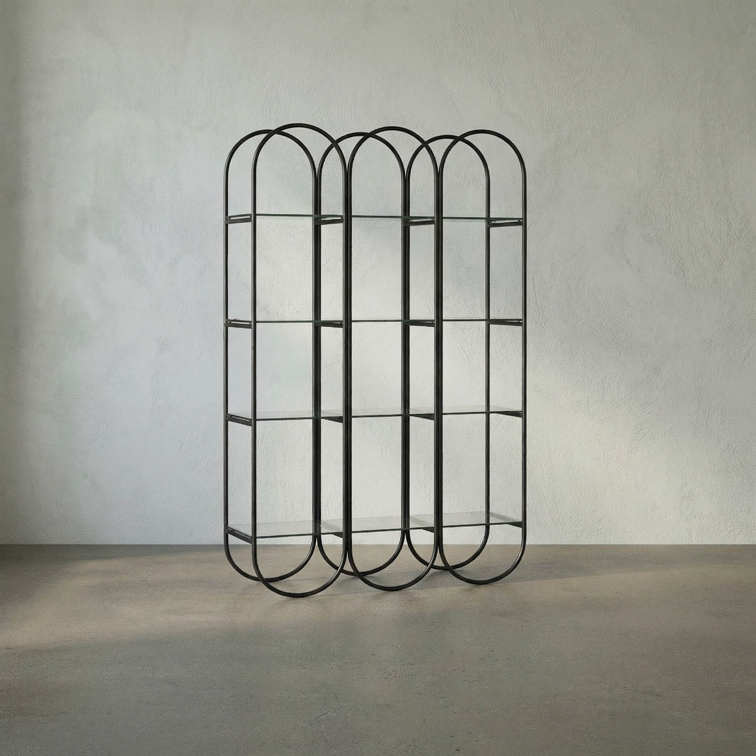 This sculptural bookcase features a tall, arched Matte-Black iron frame with rounded supports, creating a rhythmic aesthetic. Three tiers of glass shelves offer generous storage, blending minimalism with a hint of Art Deco.