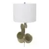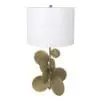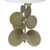 The Vadim Table Lamp features an antique brass base with petal-like metal details and is complemented by a white shade, creating a refined and sculptural lighting accent.
