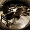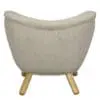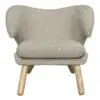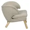 A lounge chair that features a soft beige fabric, a sculpted backrest with subtle curves, and plush cushioning. Its light wood angled legs and playful silhouette offer a cozy, modern-retro charm perfect for casual spaces.