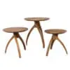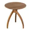 The teak Vikram Side Table features a round top with three twisting arched legs that converge at the center. Its warm tone and refined curves blend functionality with artistic design, perfect as an accent.