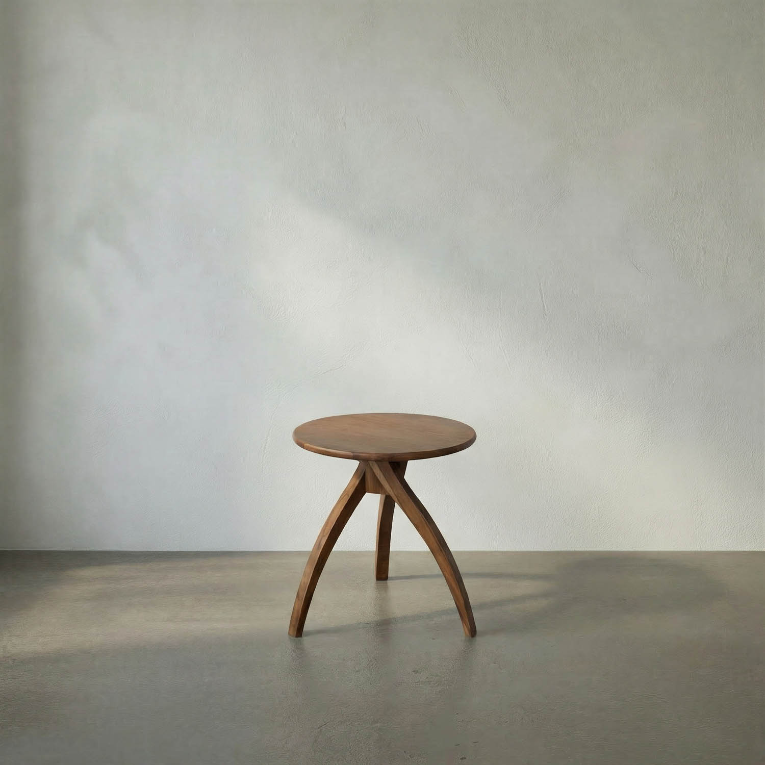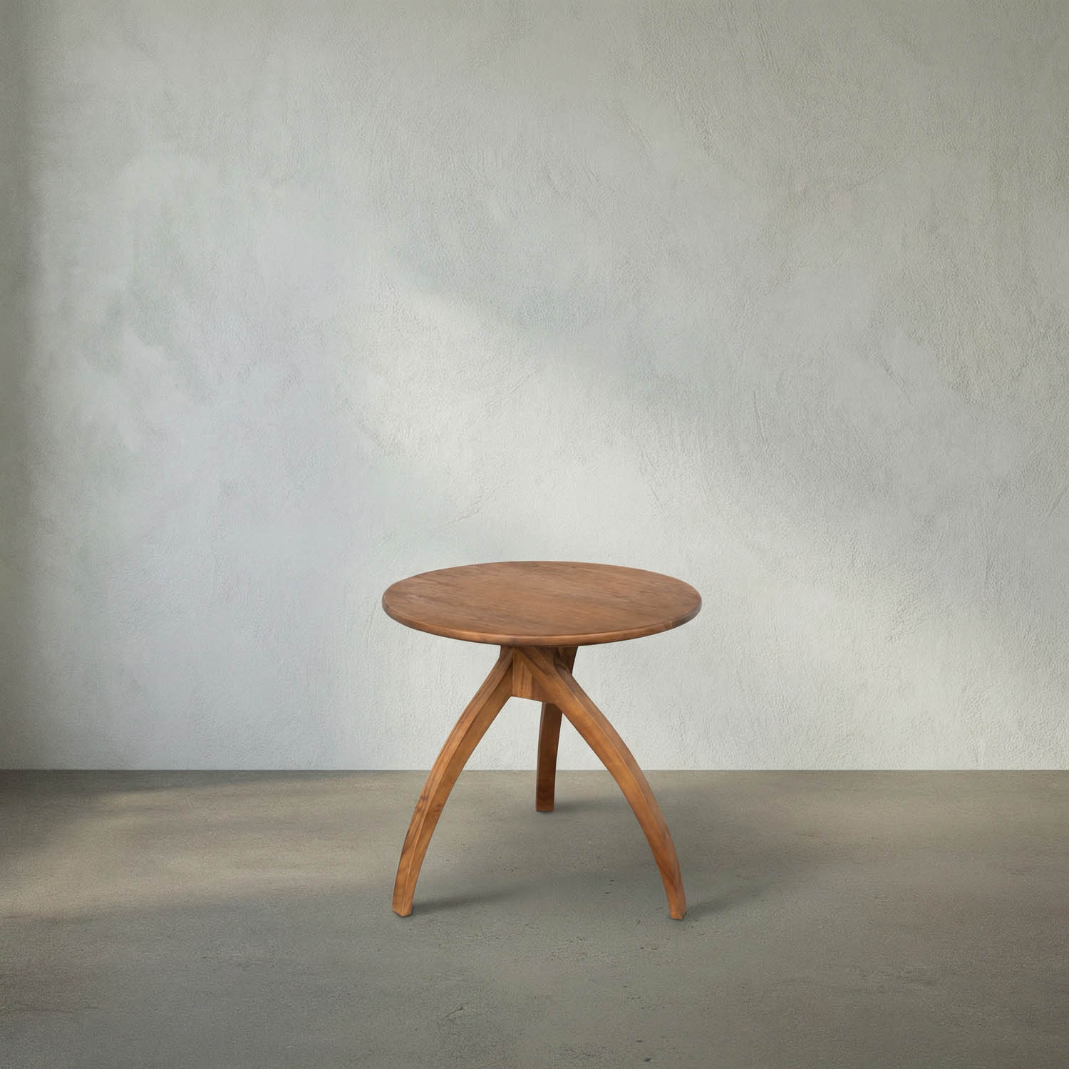The teak Vikram Side Table features a round top with three twisting arched legs that converge at the center. Its warm tone and refined curves blend functionality with artistic design, perfect as an accent.