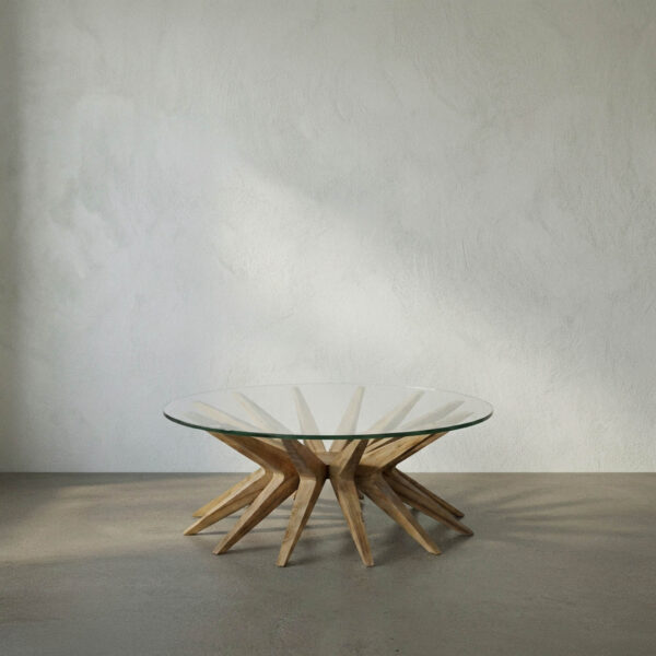 Handcrafted in solid Teak, our Waldo Coffee Table combines a repeating boomerang shape into a dynamic sunburst shape base topped with a 40″ round glass top for the perfect blend of organic and modern.