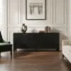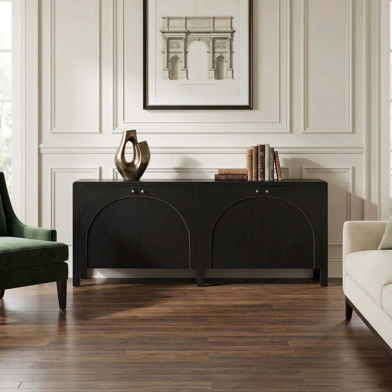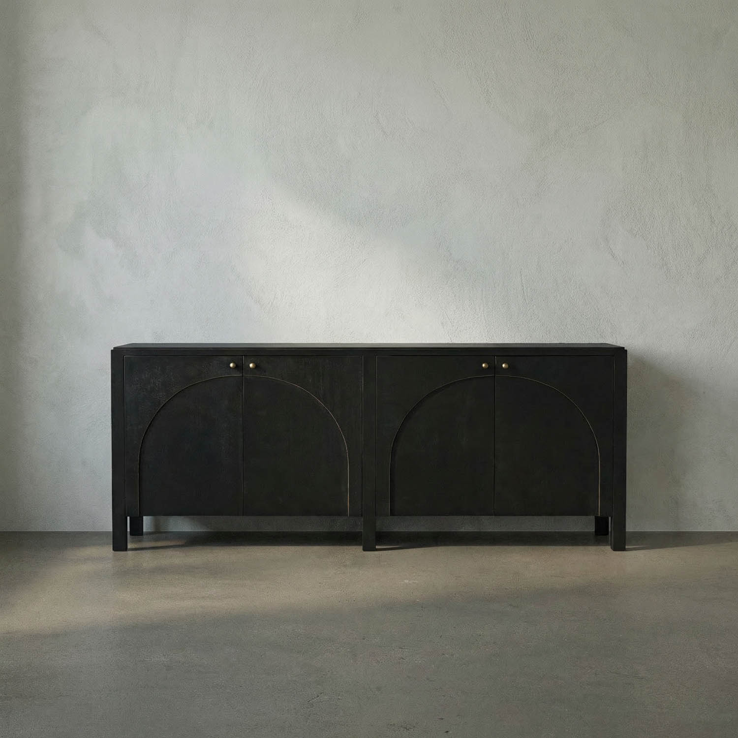 The Weston Sideboard features our Hand-Rubbed Black finish with warm light brown trim, highlighting its four arched doors. Solid brass hardware and clean lines complete its look–bold yet balanced, perfect for refined, modern-classic interiors.