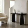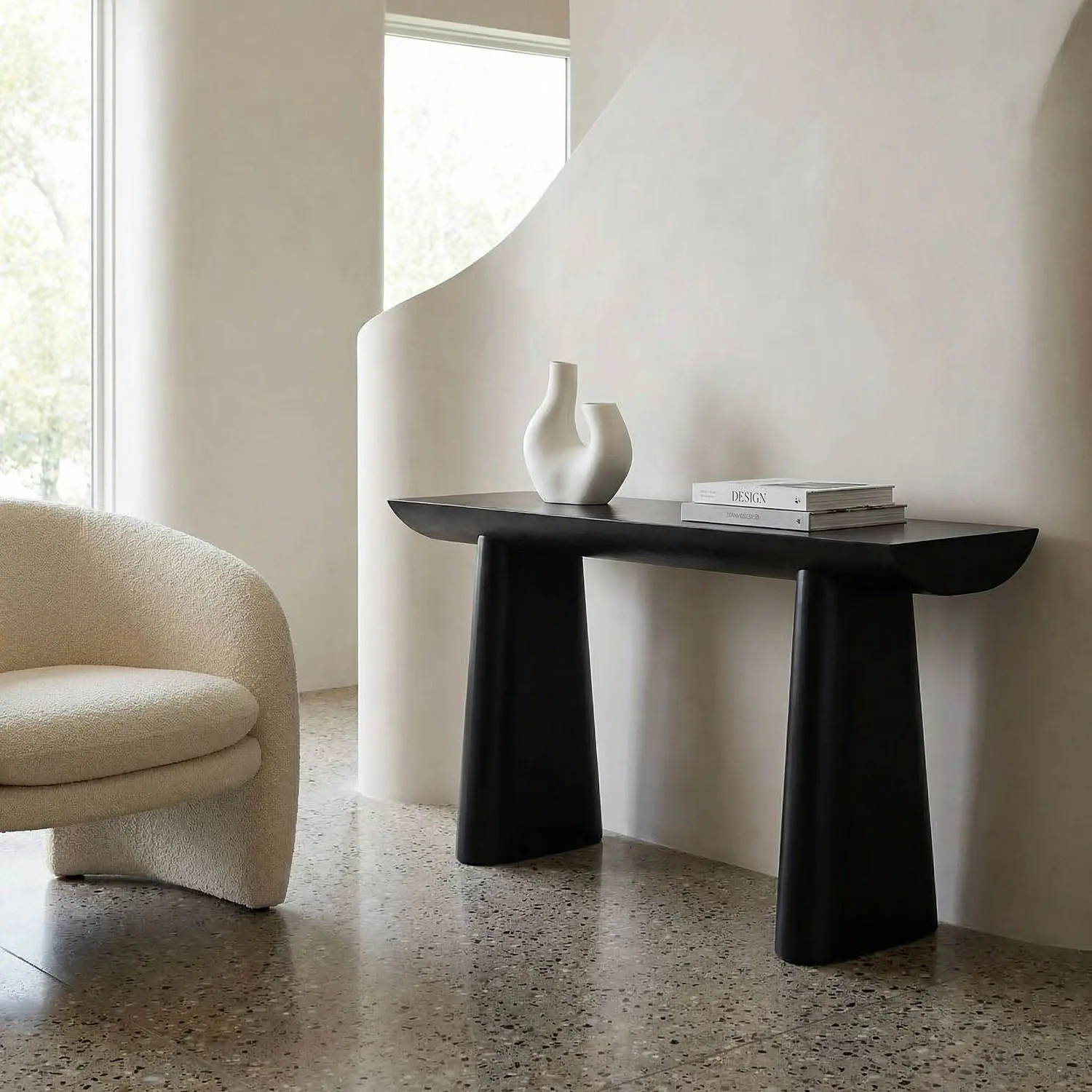 The Winston Console is a sleek, minimalist piece crafted from matte black iron. Its clean, altar-like silhouette and subtle industrial detailing create a bold, architectural presence.
