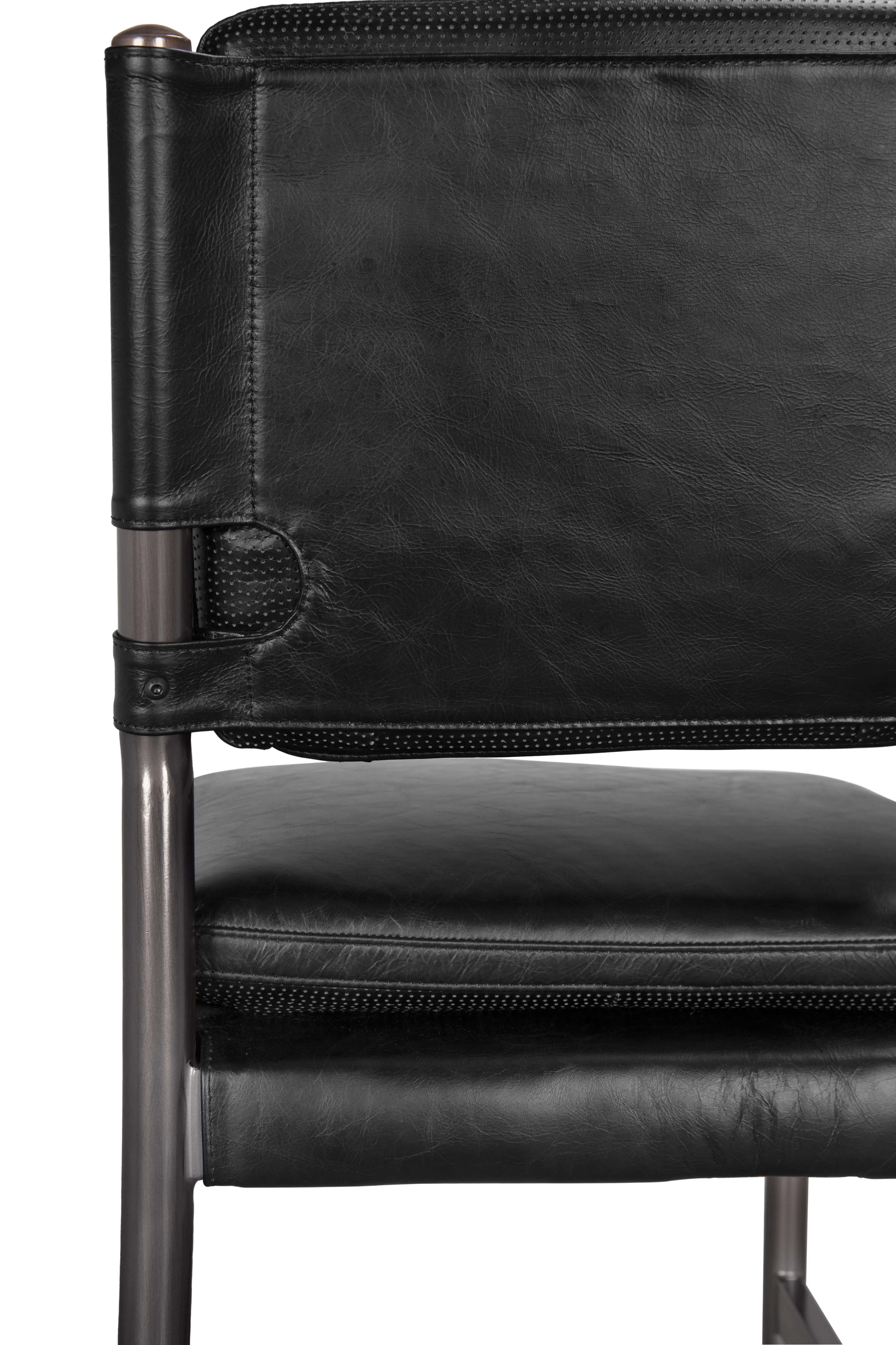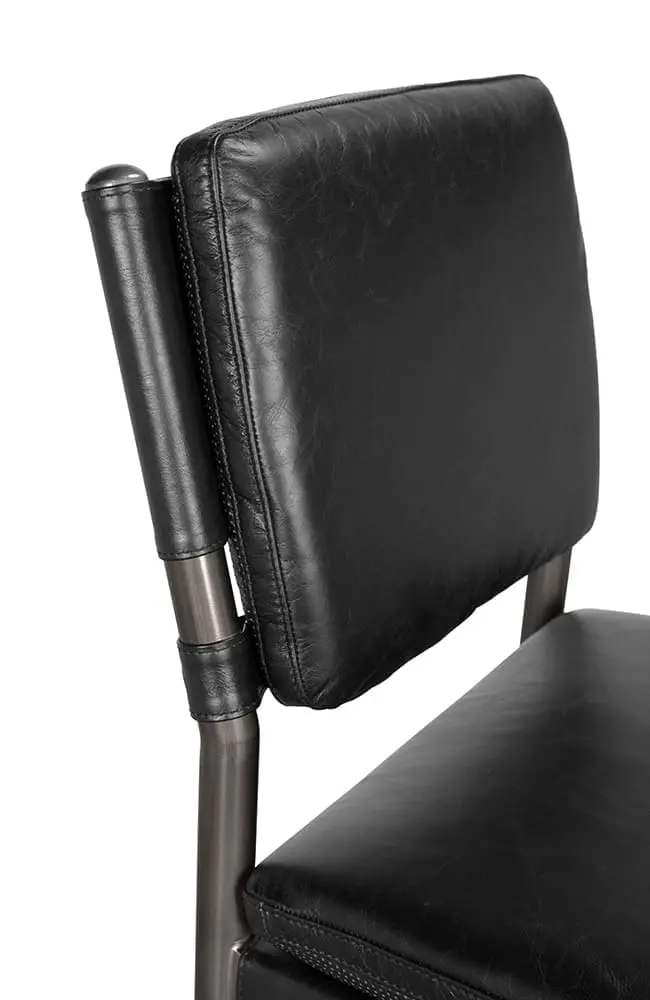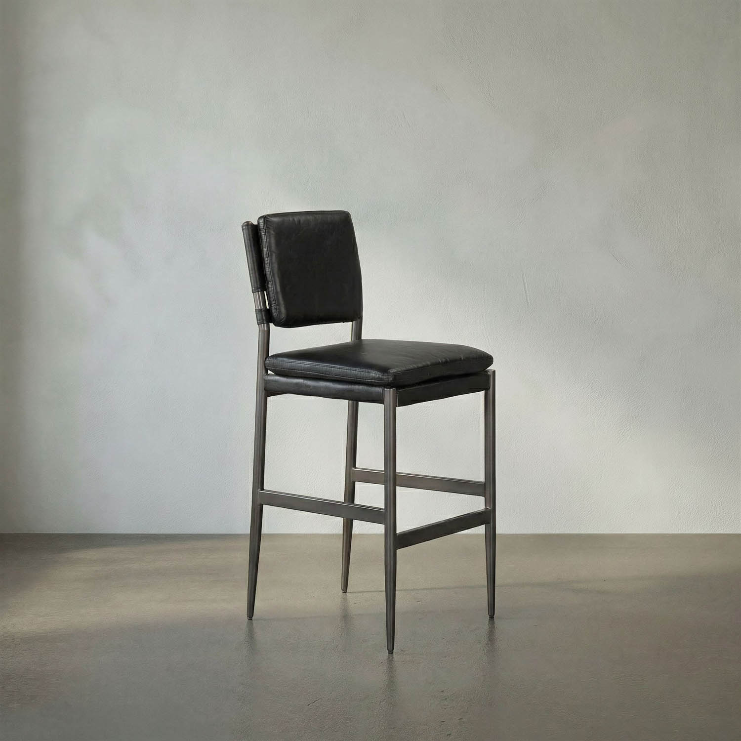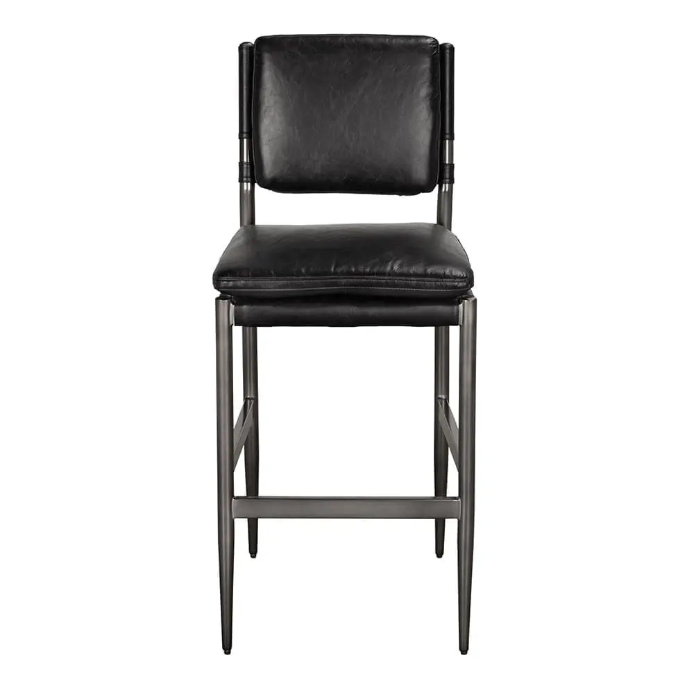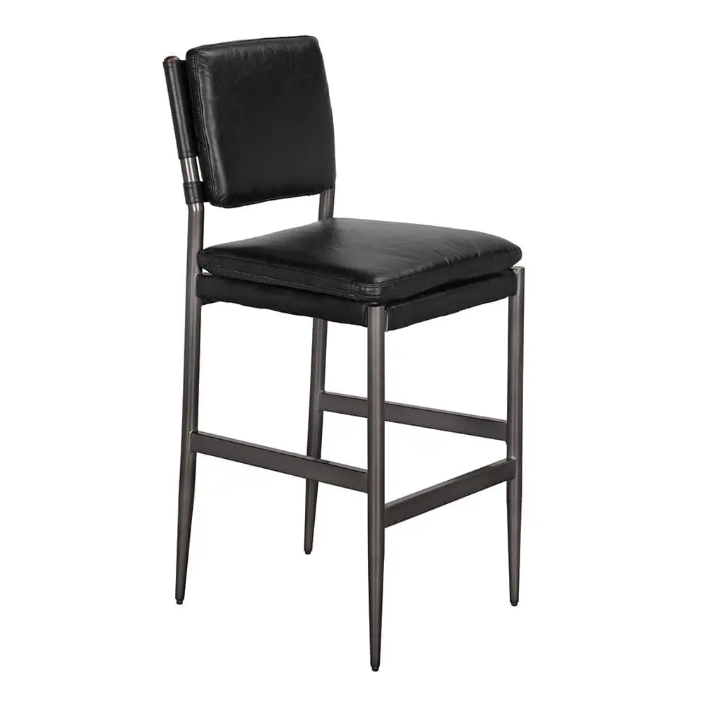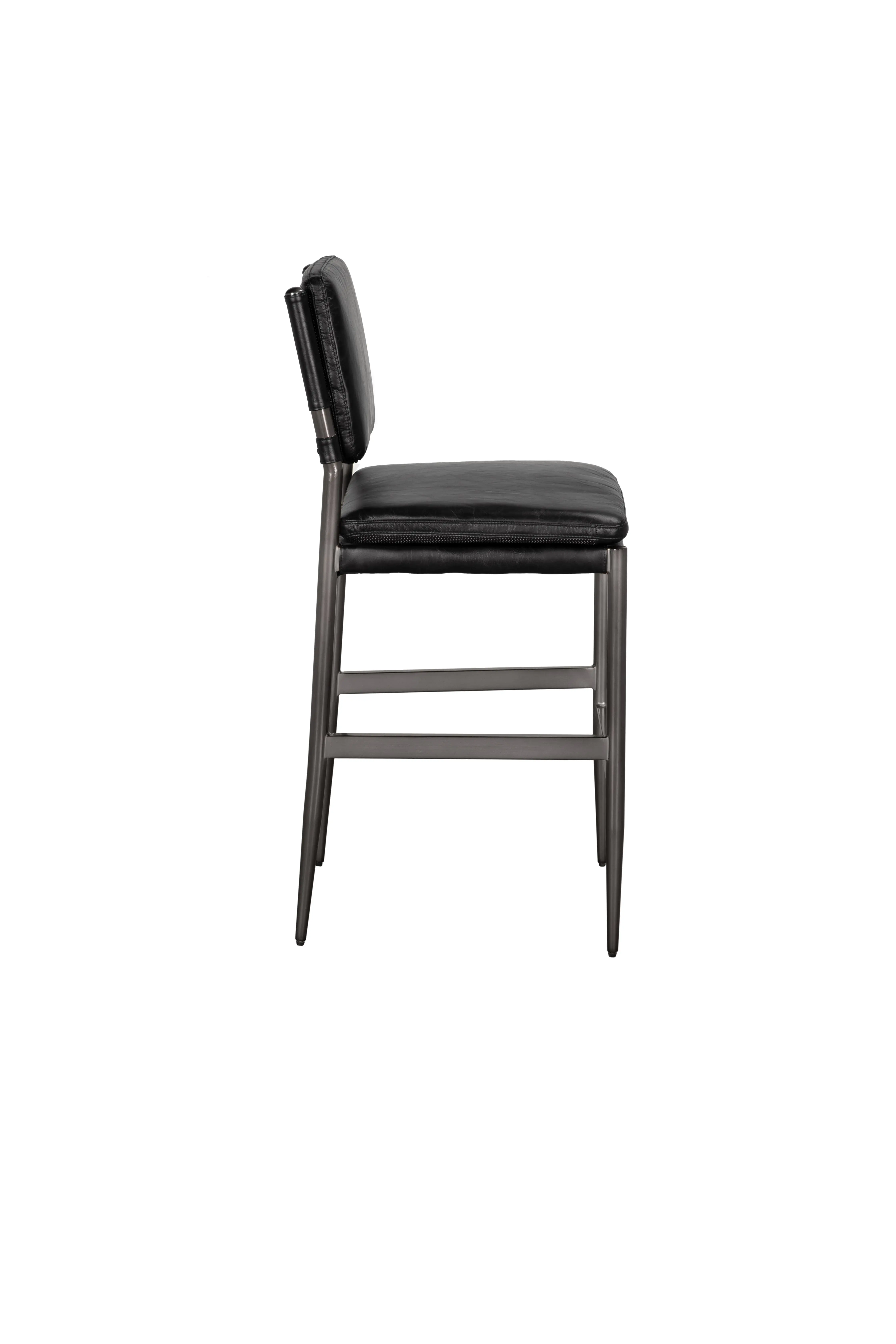 The Wooster Bar Stool features a powder-coated iron frame and black top-grain leather. The clean design offers comfortable and refined seating.