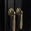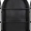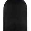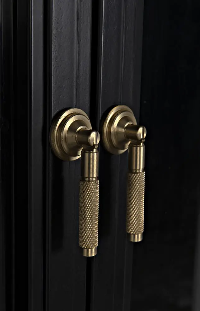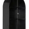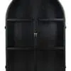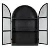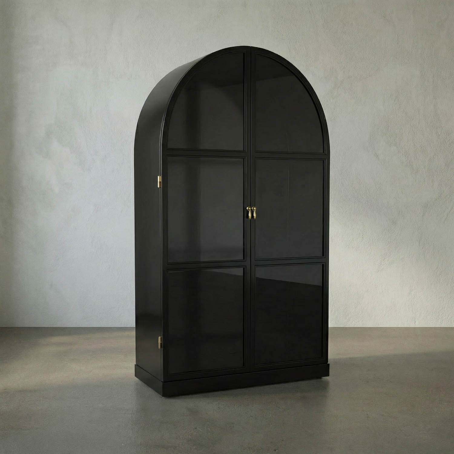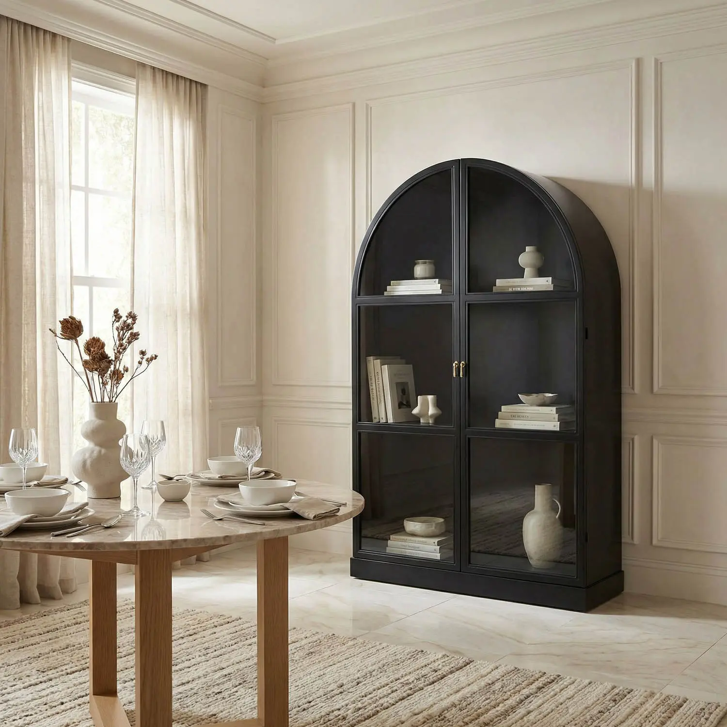 The Yoke Hutch features Matte Black finished iron, arched glass-front doors, and tempered glass shelves, creating a bold silhouette and providing ample display storage for modern and transitional interiors.